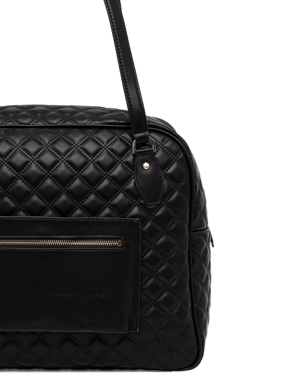 черная стеганая сумка с верхней ручкой, застежкой-молнией, передним карманом на молнии и логотипом на металлической табличке