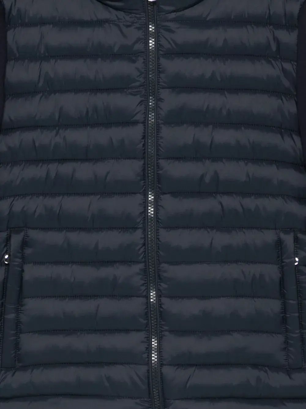 тёмно-синие ребристые манжеты, застёжка-молния, капюшон, стёганая передняя часть, накладные карманы