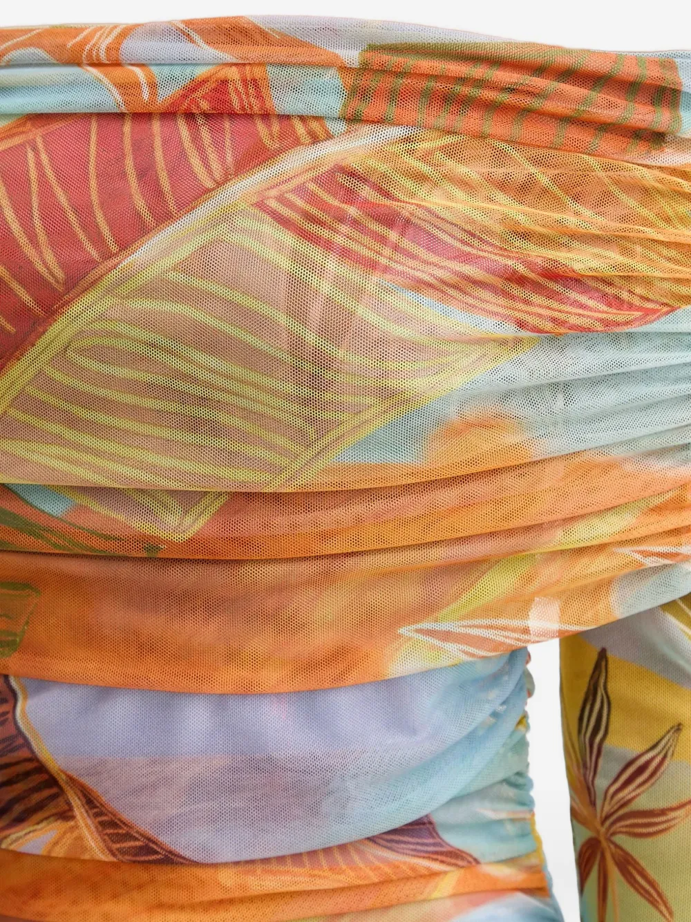 синий и разноцветный цветочный принт, сборки, открытые плечи, длинные рукава