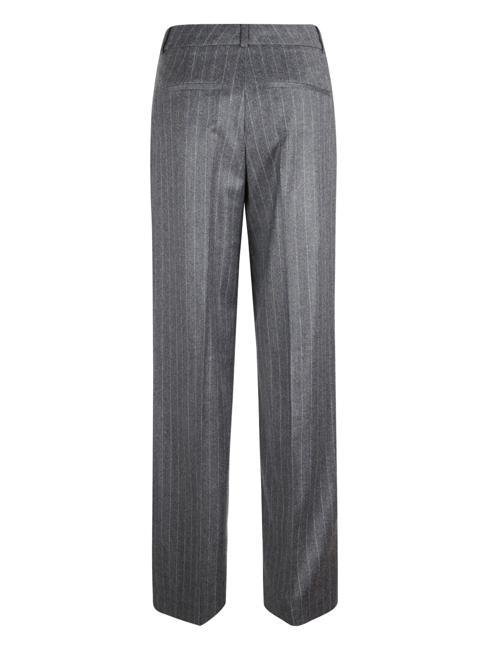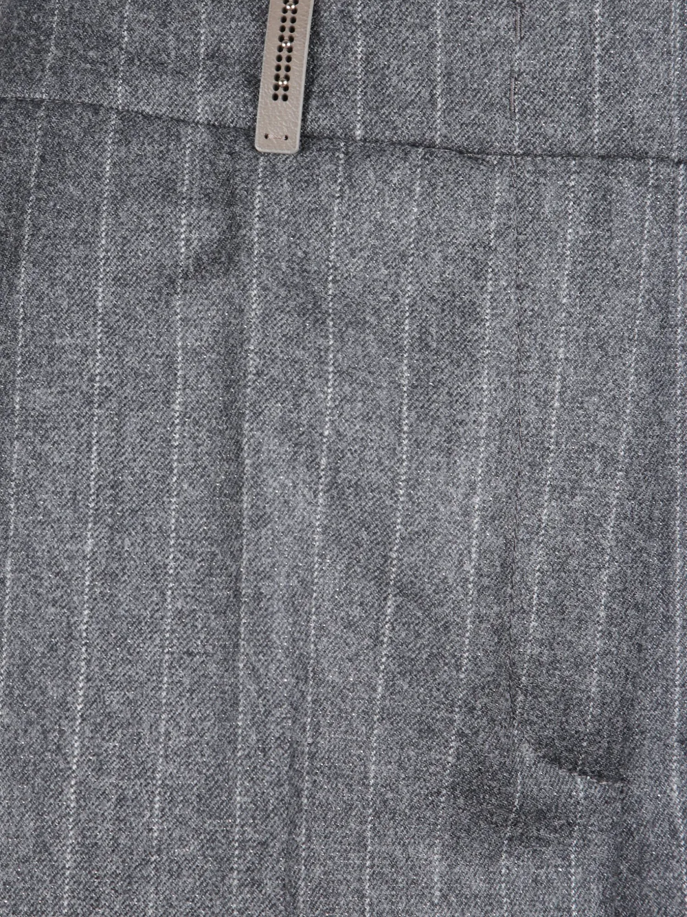 серый цвет, узор в тонкую полоску, шлевки для пояса, скрытая застежка, задний прорезной карман