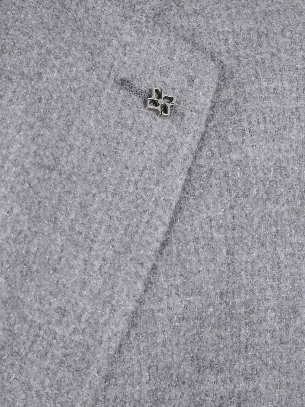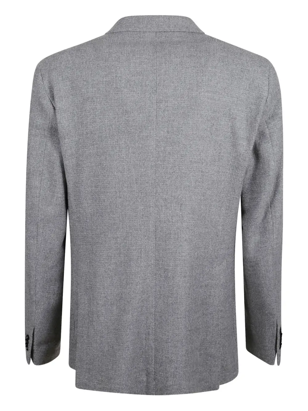 жемчужно-серый однобортный пиджак на пуговицах с накладными карманами и лацканами с вырезом