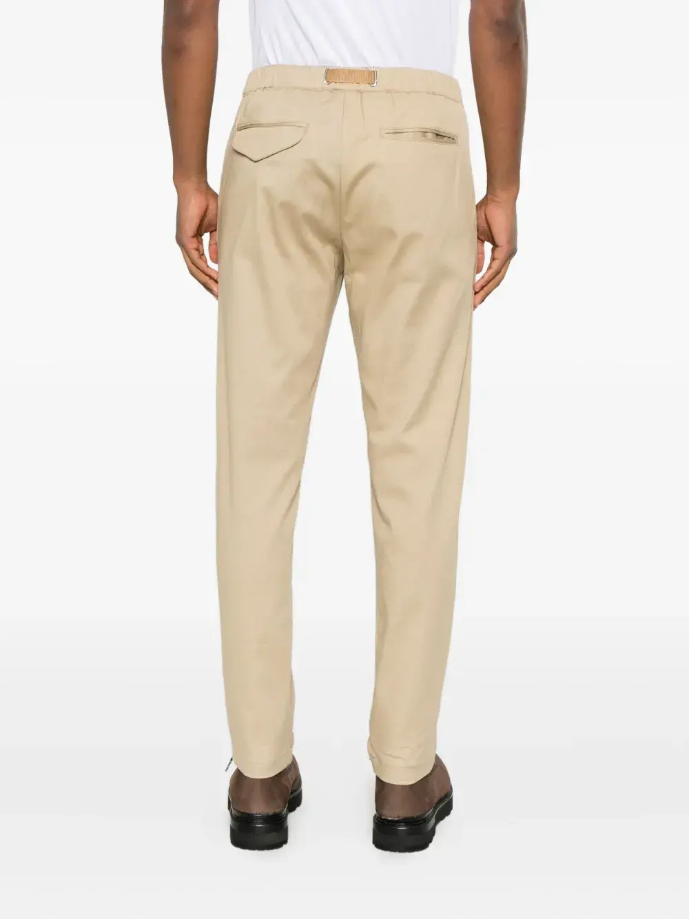 бежевые брюки с эластичным поясом, боковыми карманами в швах, задним прорезным карманом и тональной строчкой