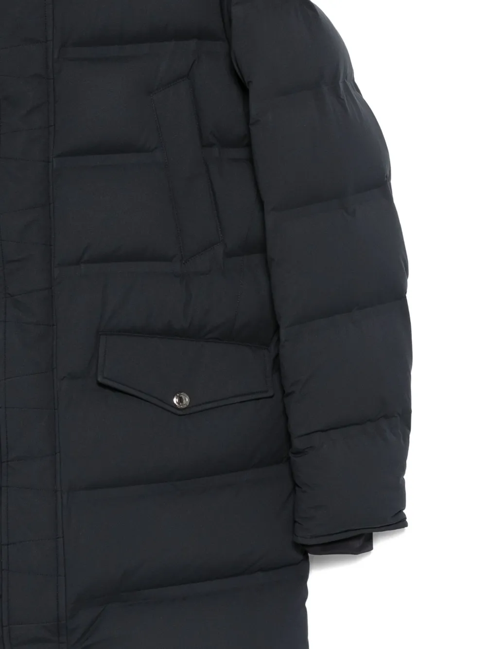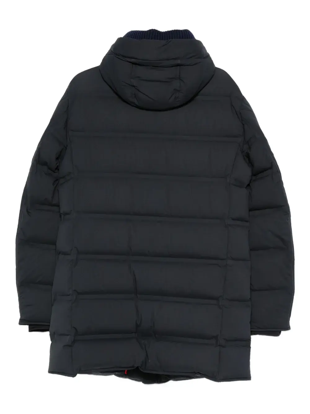 синий цвет, стеганый дизайн, вязаный воротник, передние карманы с клапанами, застежка на пуговицы, капюшон