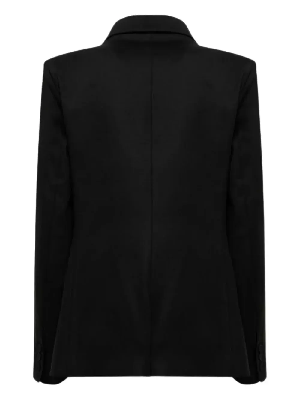 чёрный двубортный пиджак с острыми лацканами, застёжкой на пуговицы, длинными рукавами и клапанами на карманах