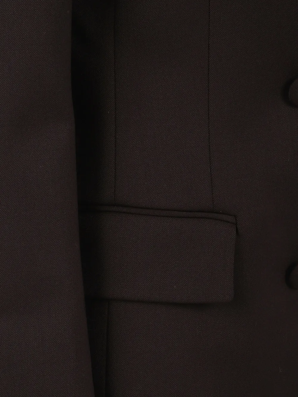 темно-коричневый двубортный пиджак с острыми лацканами, застежкой на пуговицы, клапанами на карманах и нагрудным прорезным карманом