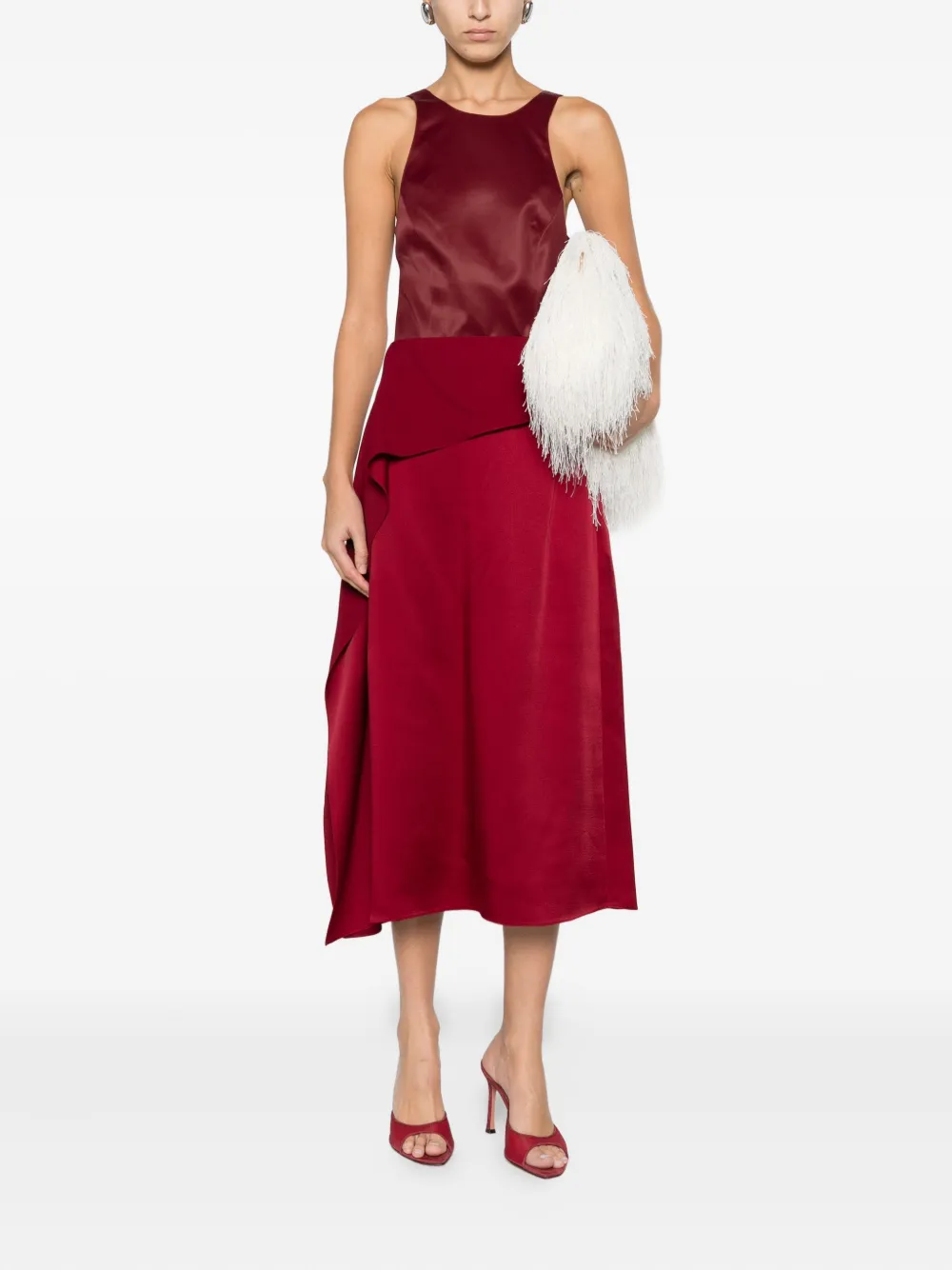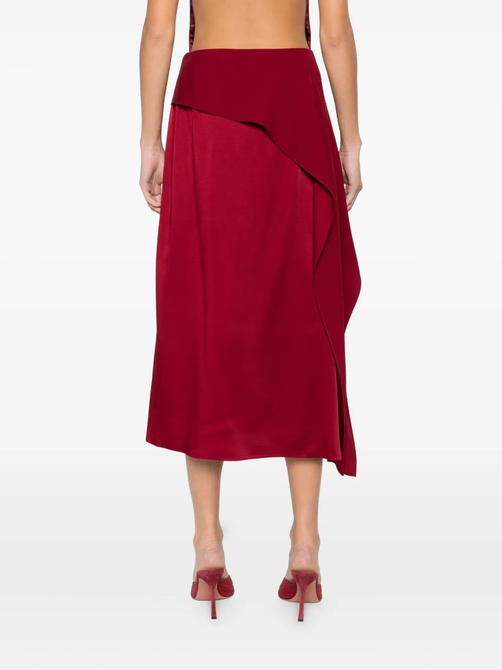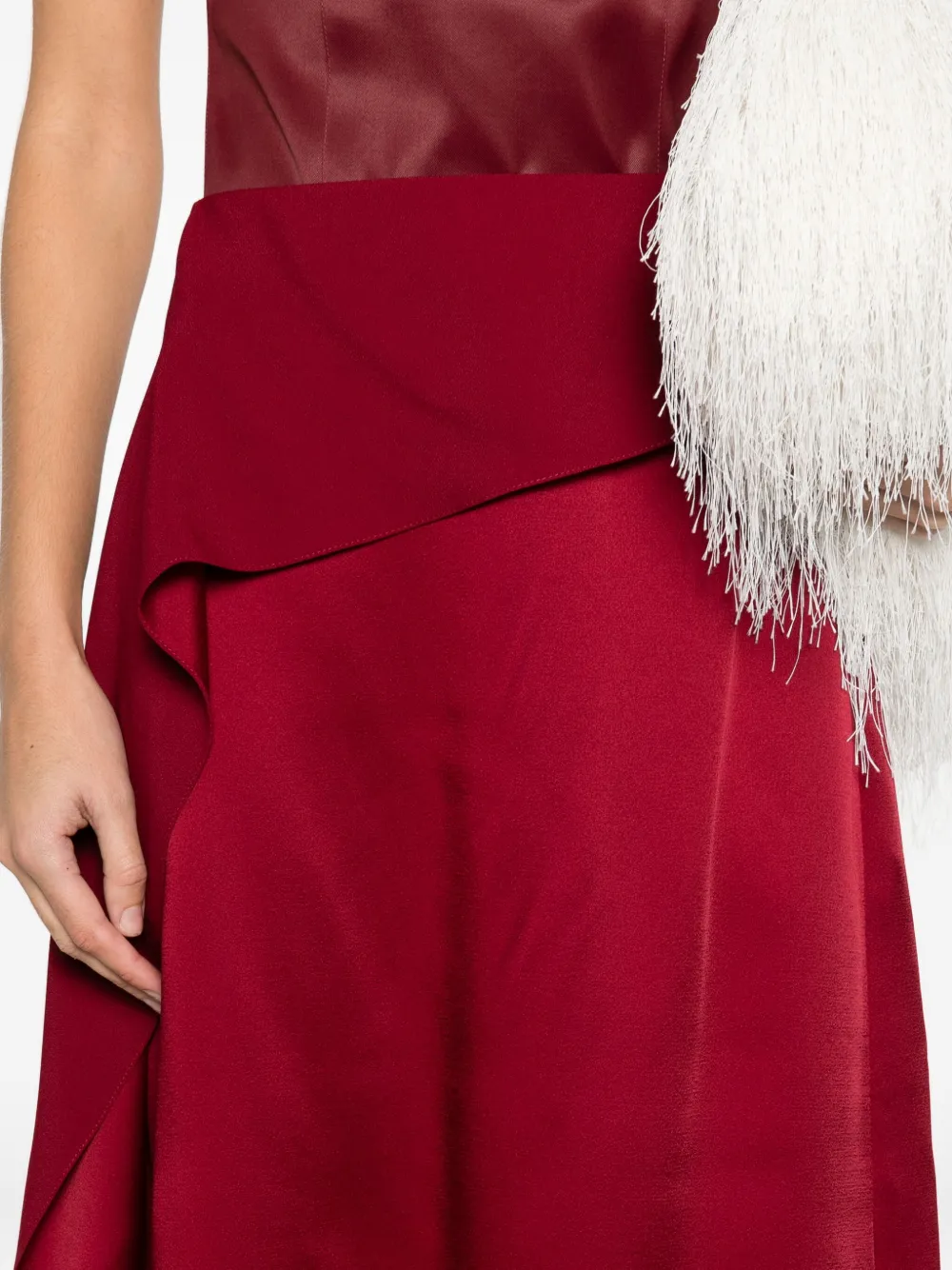 рубиново-красный цвет, детали с драпировкой, асимметричный крой, скрытая застежка, средняя длина