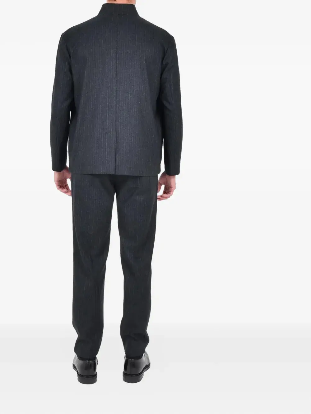темно-серый цвет с узором в тонкую полоску, застежка на пуговицы спереди, стойка-воротник, накладные карманы спереди, длинные рукава, прямой низ