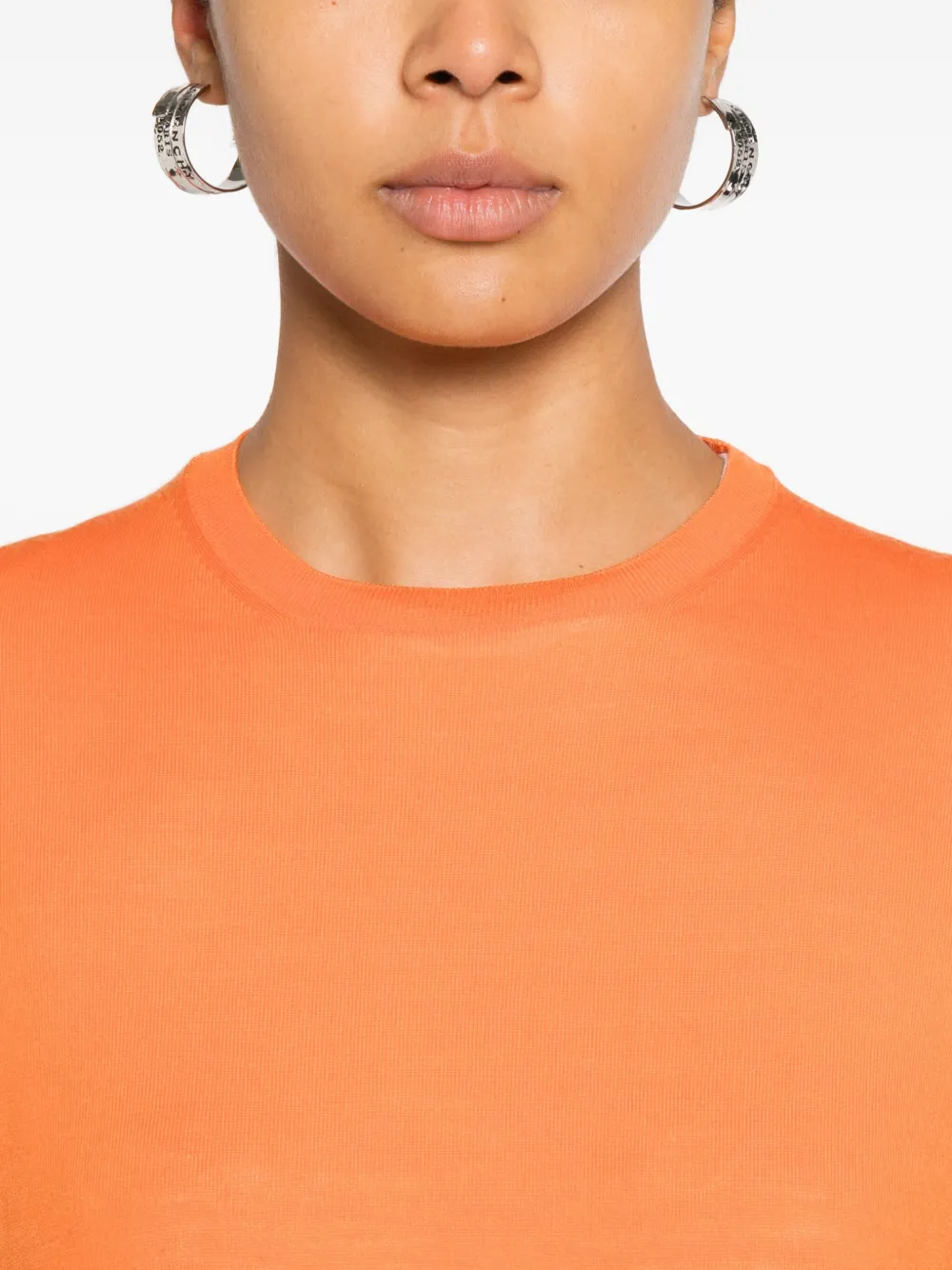 оранжевая футболка с короткими рукавами, круглым вырезом и ребристыми краями