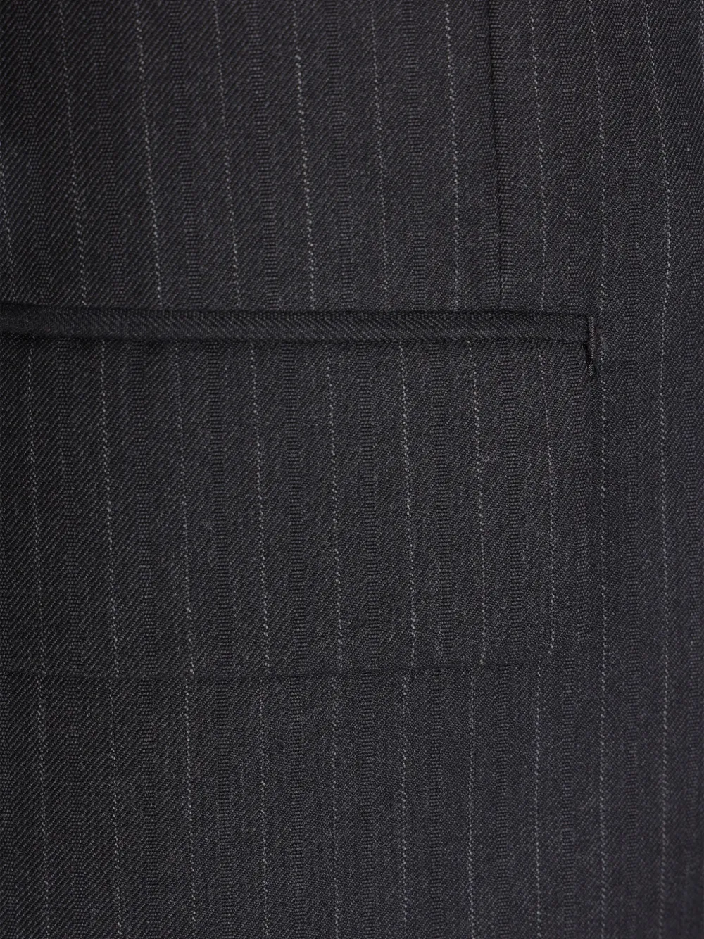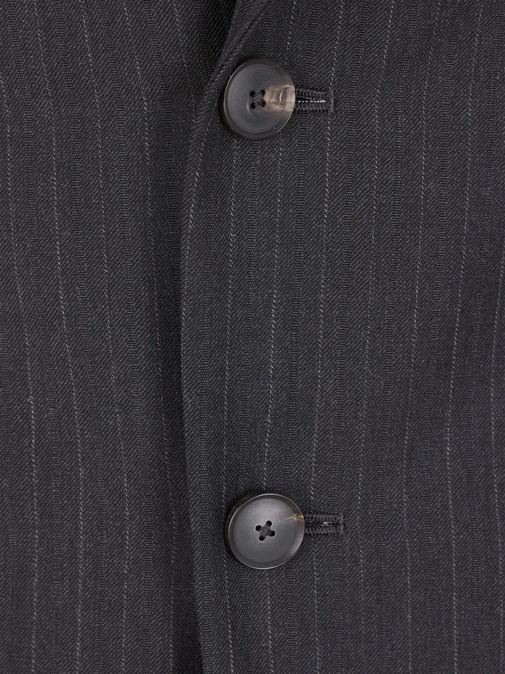 угольно-синий и тёмно-синий в полоску, застёжка на две пуговицы, лацканы с вырезом, клапанные карманы, манжеты на пуговицах, один шлиц