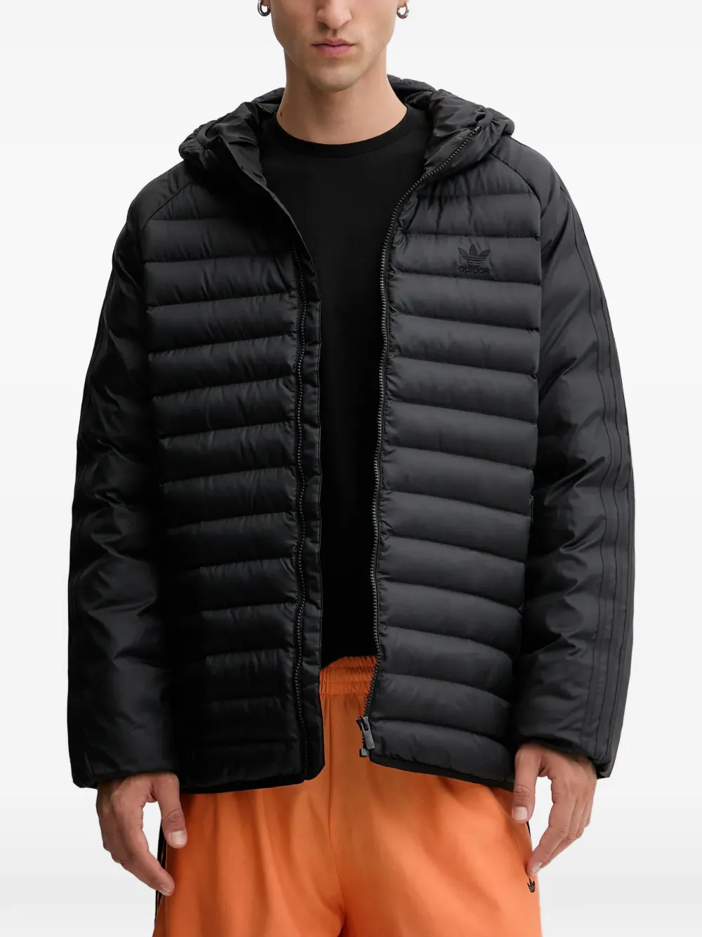 чёрная толстовка с тремя полосками на плечах, капюшоном, застёжкой-молнией, стёганым дизайном и логотипом