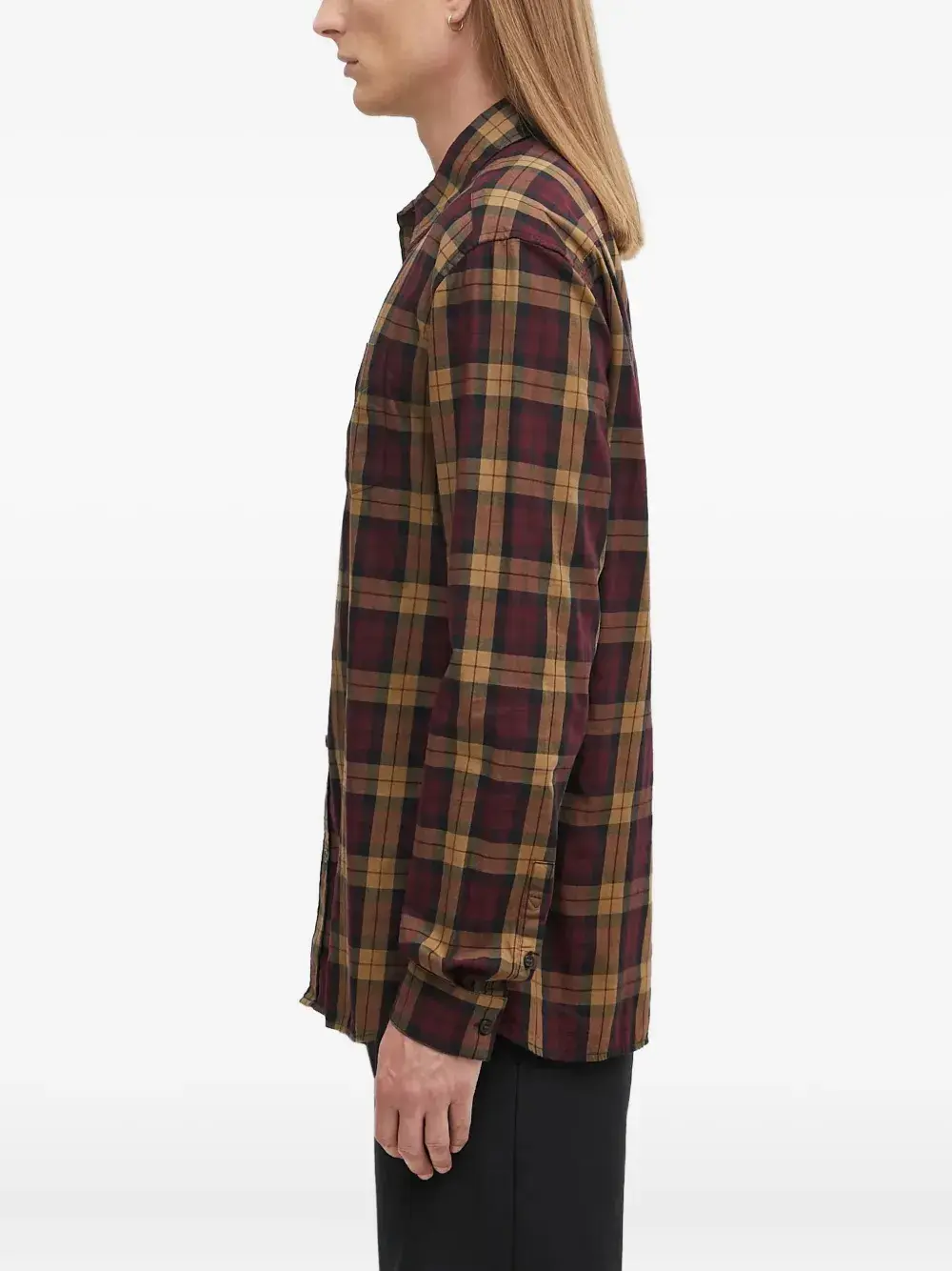 коричневая рубашка в клетку с накладным карманом, застёжкой на пуговицы, длинными рукавами и вышитым логотипом
