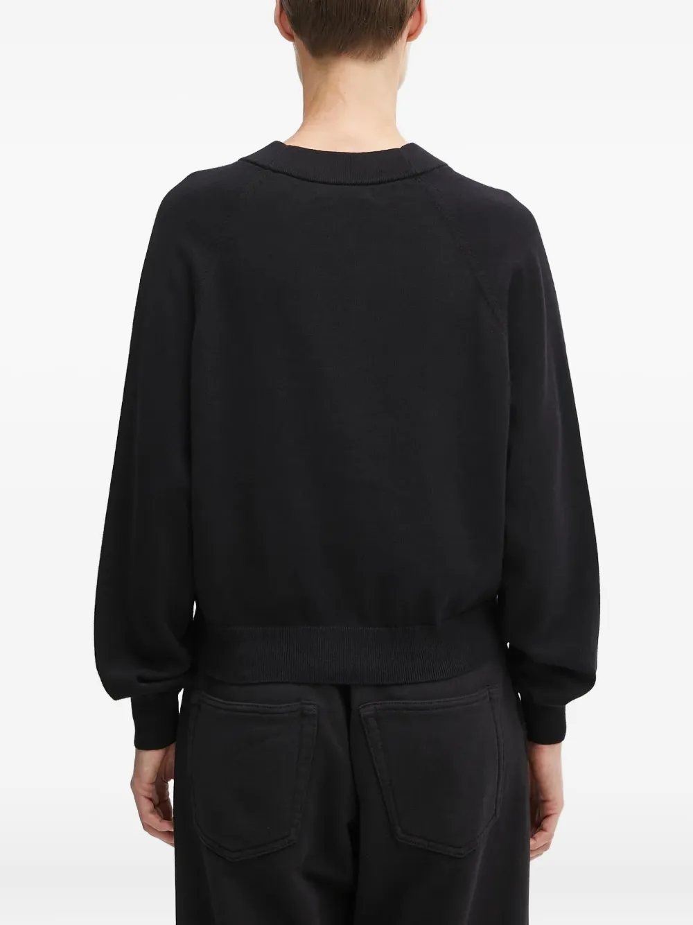 черный с V-образным вырезом, застежкой на пуговицы, длинными рукавами и вышитым логотипом