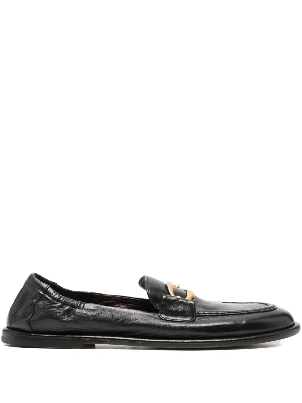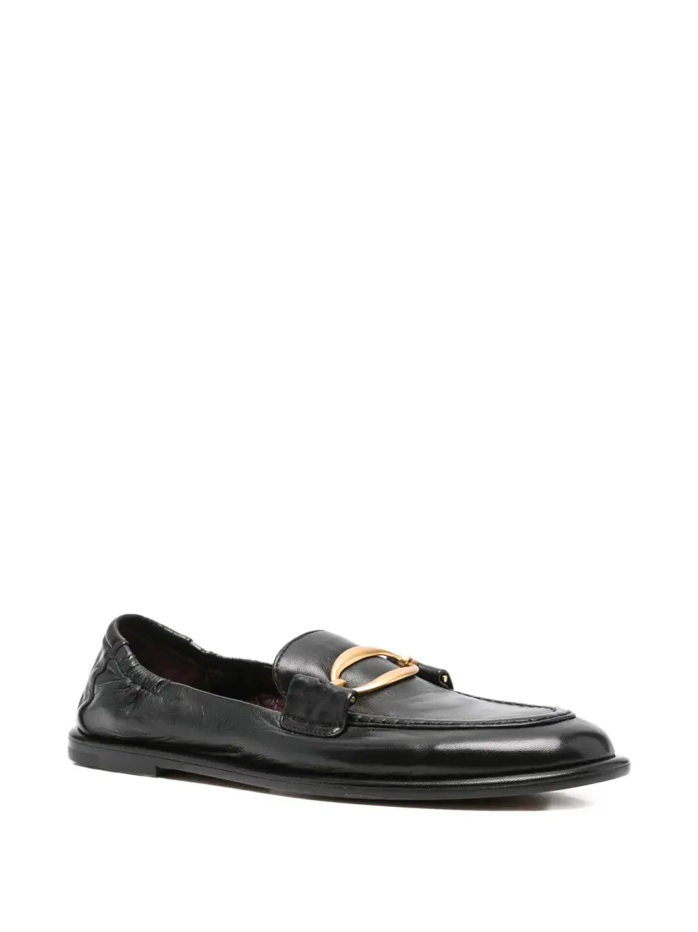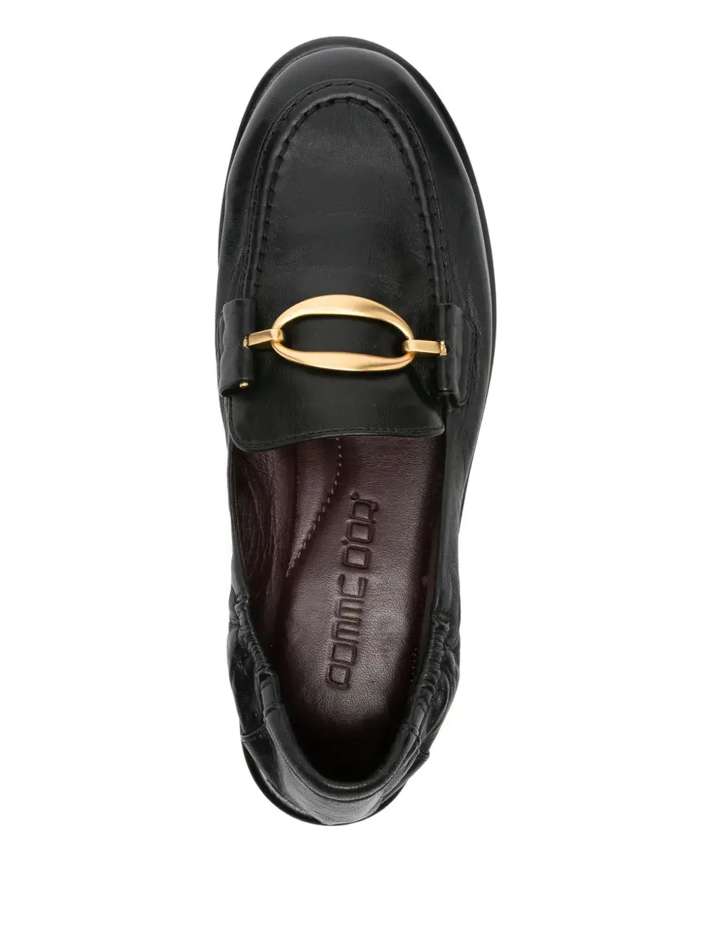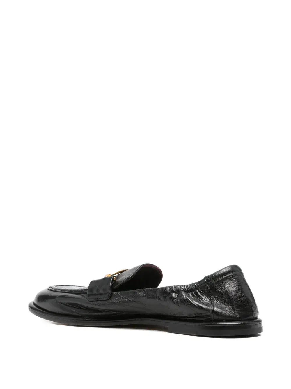 верх из черной кожи, овальная пряжка золотистого цвета, модель без застежки, круглый носок, плоская подошва