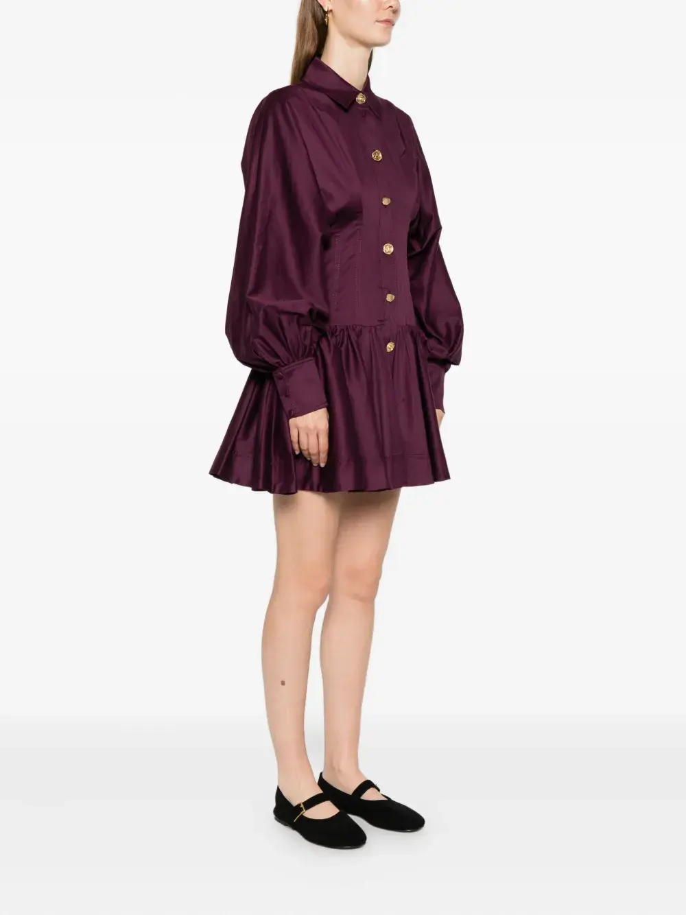красные пуговицы, застёжка, длинные рукава, оборчатый низ, воротник с острыми концами, многослойная конструкция