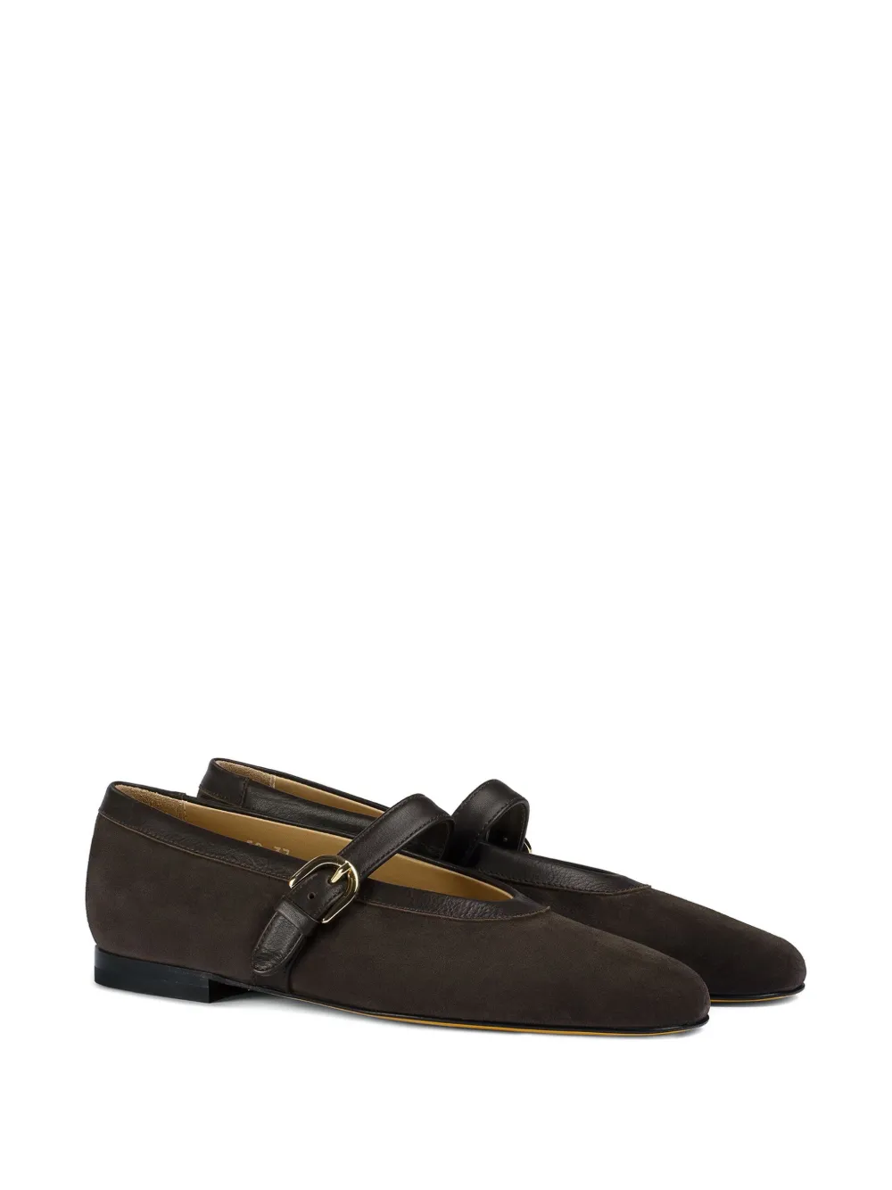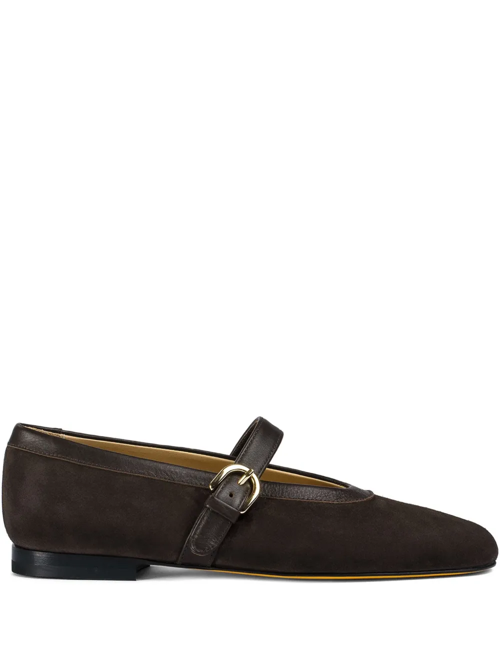 темно-коричневые замшевые туфли с ремешком и пряжкой, на плоской подошве, с круглым носком