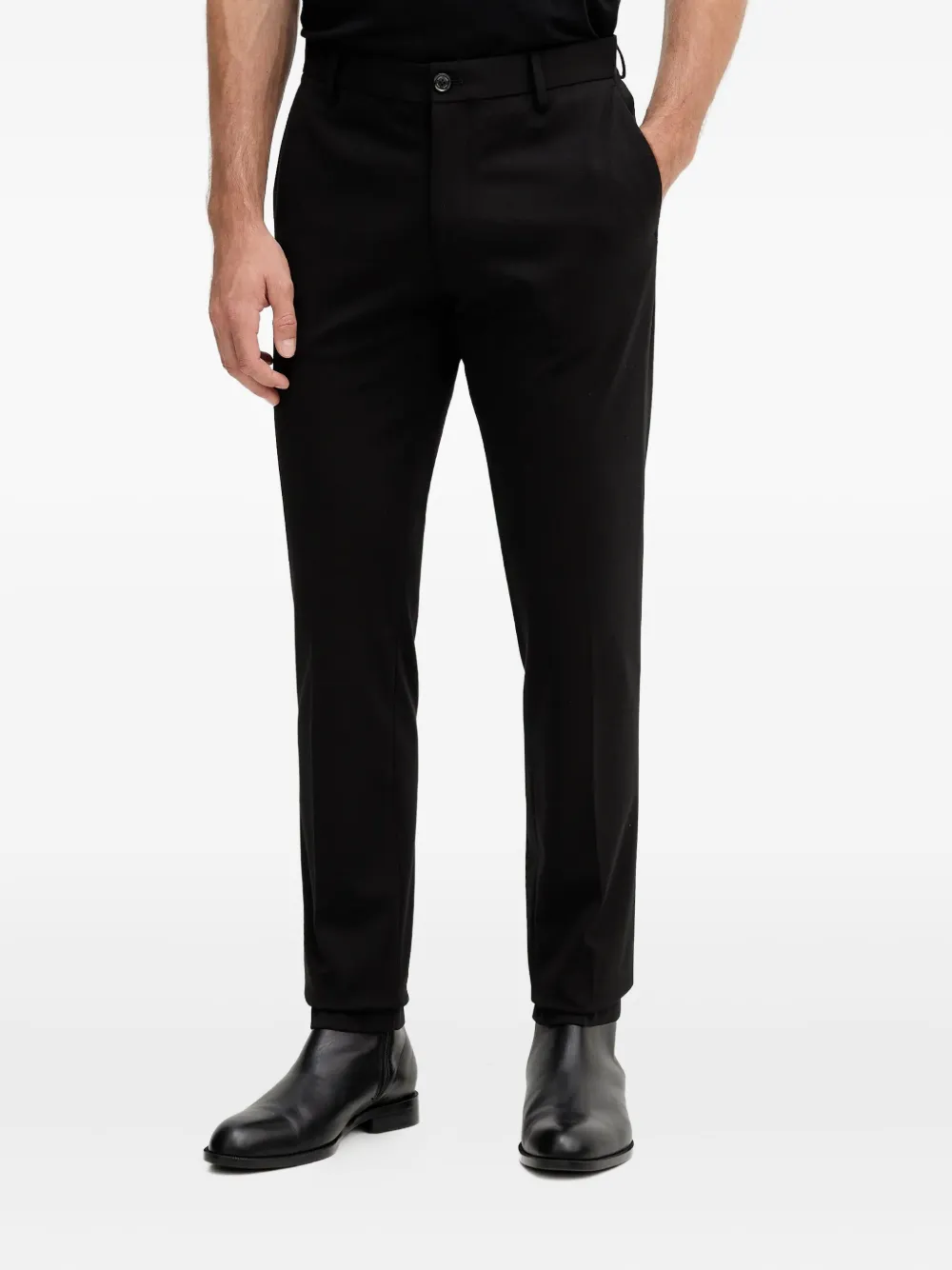черные, застегиваются на пуговицу, шлевки для ремня, задний прорезной карман, боковые карманы в шве