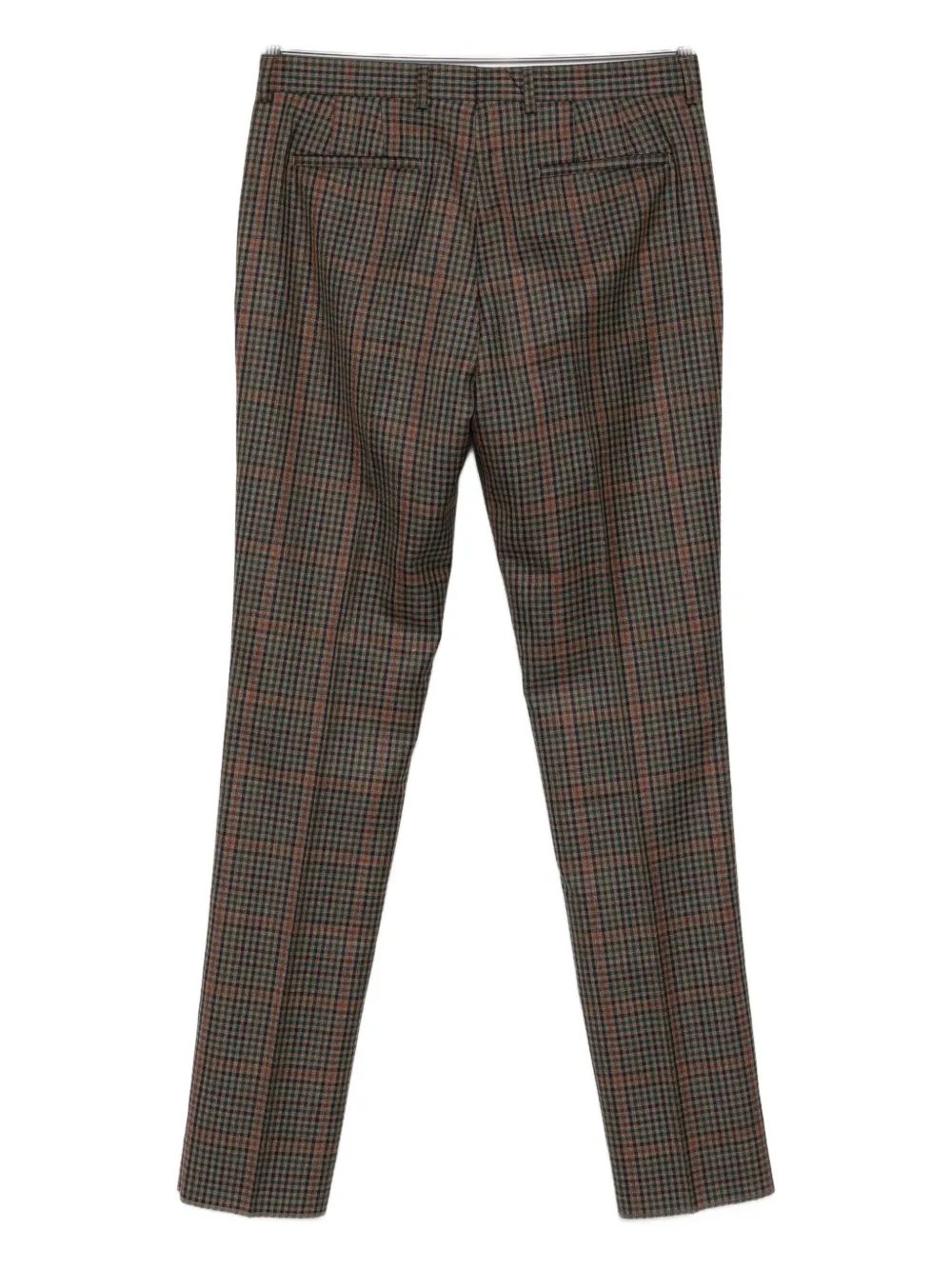 коричневый цвет, клетчатый узор, шлевки для ремня, два боковых кармана с разрезами, два задних прорезных кармана, потайная застежка спереди