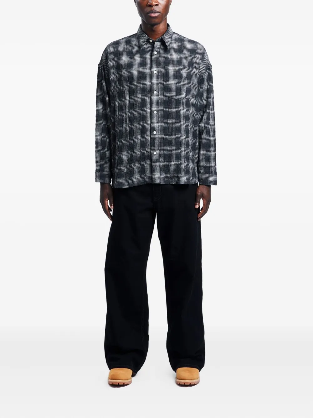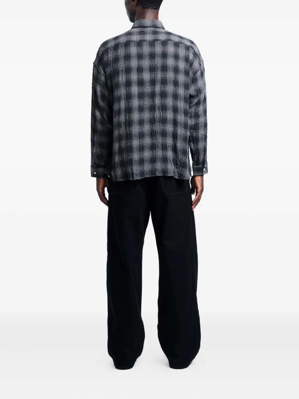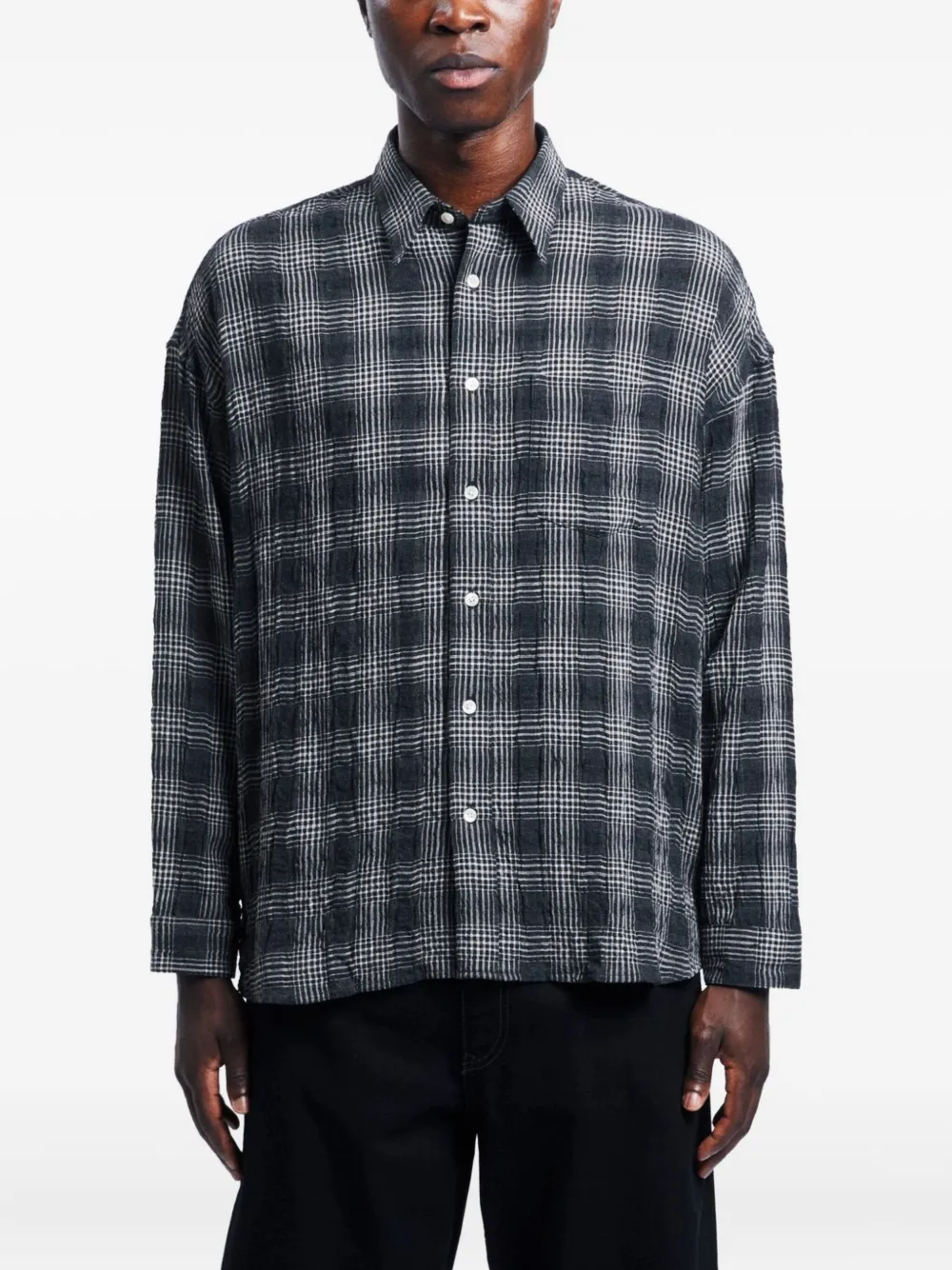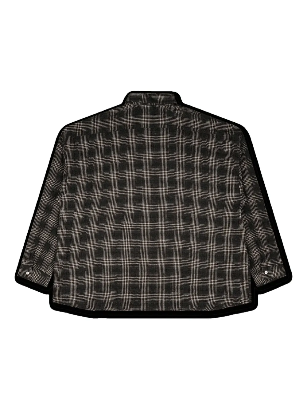 темно-серая рубашка в клетку, застежка на пуговицы, длинные рукава, манжеты на пуговицах, классический воротник