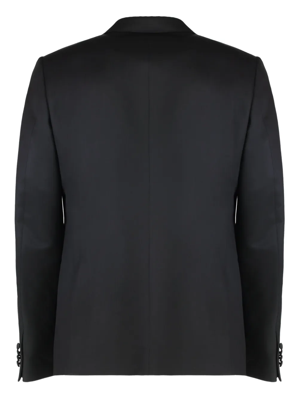 чёрный, застёгивается на пуговицы, клапаны на карманах, атласные лацканы, манжеты на пуговицах, однобортный