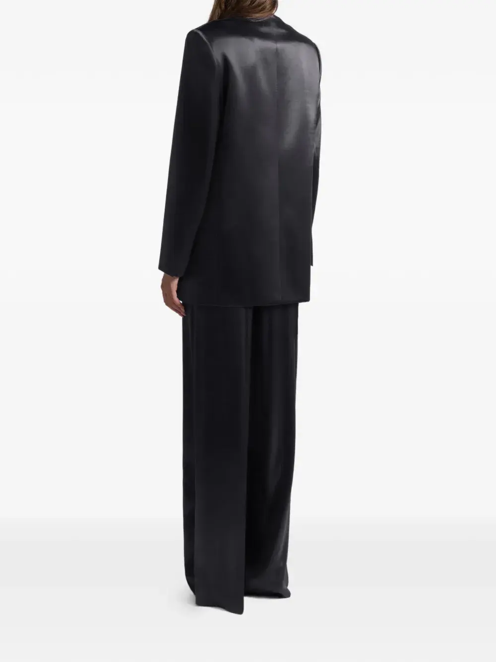 черный двубортный пиджак с лацканами, застежкой на пуговицы и прорезными карманами
