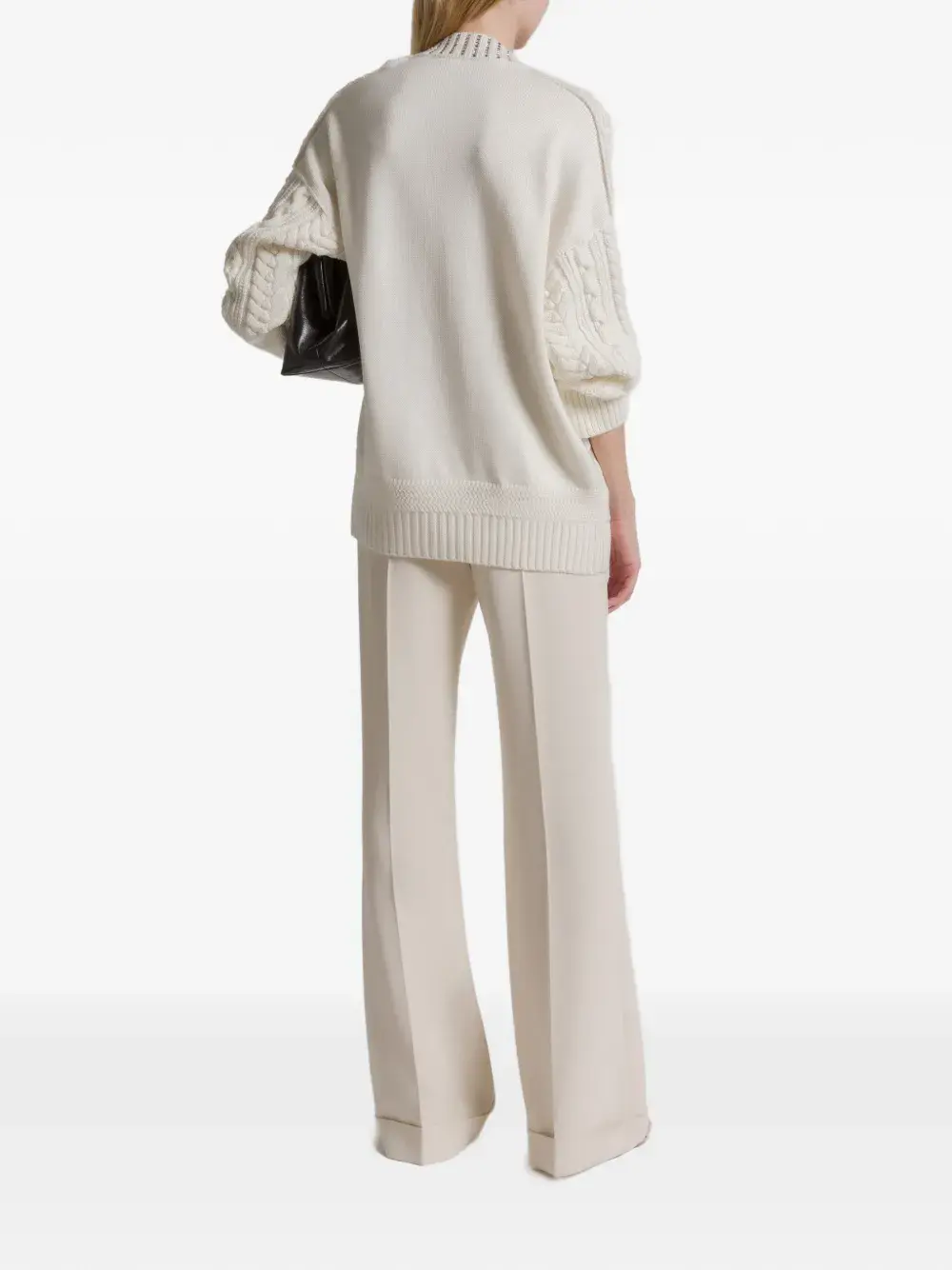 белый трикотаж с косами, украшенные детали, V-образный вырез, ребристый край, ребристые манжеты
