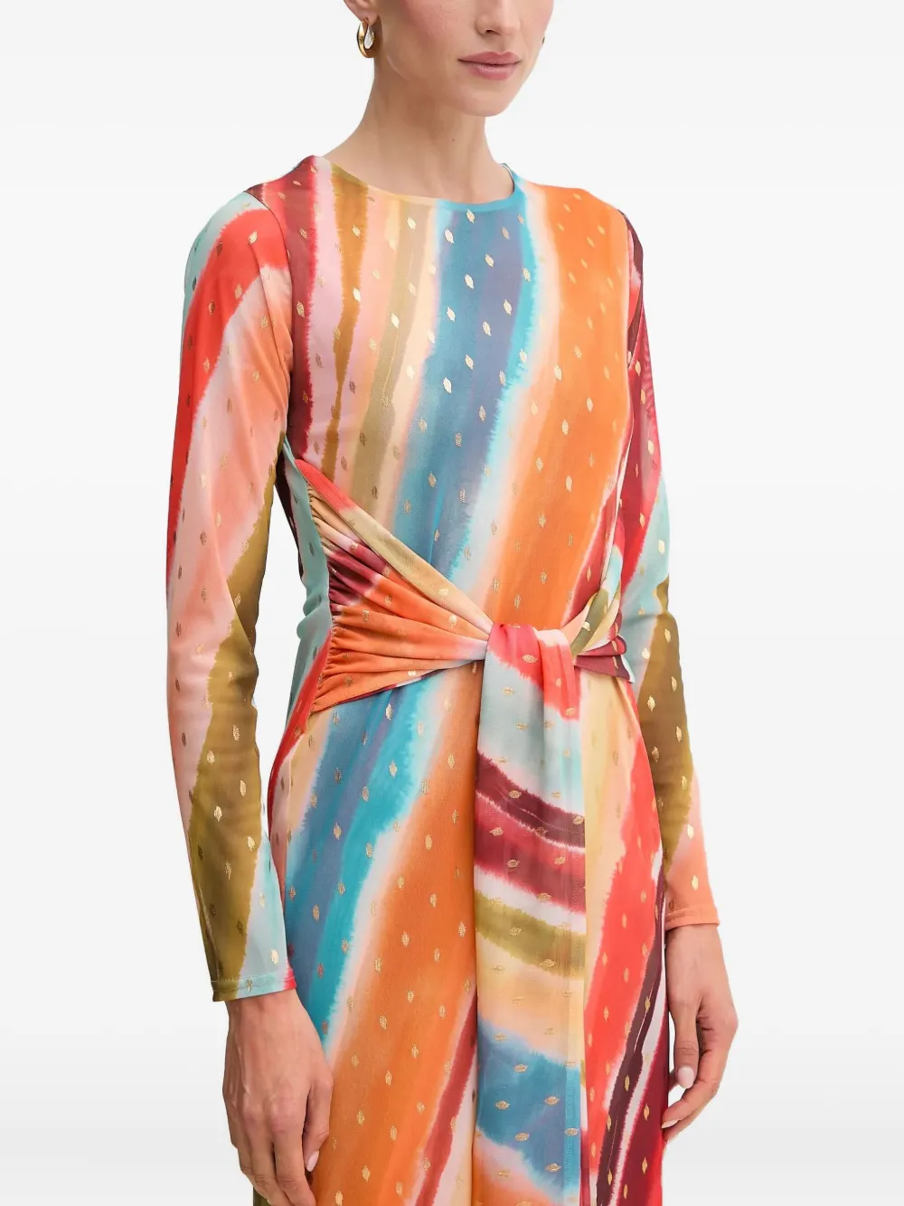 оранжевый и разноцветный топ с узлом, длинными рукавами и круглым вырезом