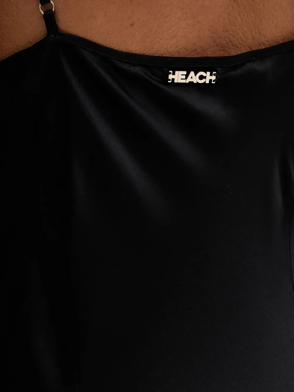 черные тонкие бретели, V-образный вырез, боковой разрез, деталь с логотипом