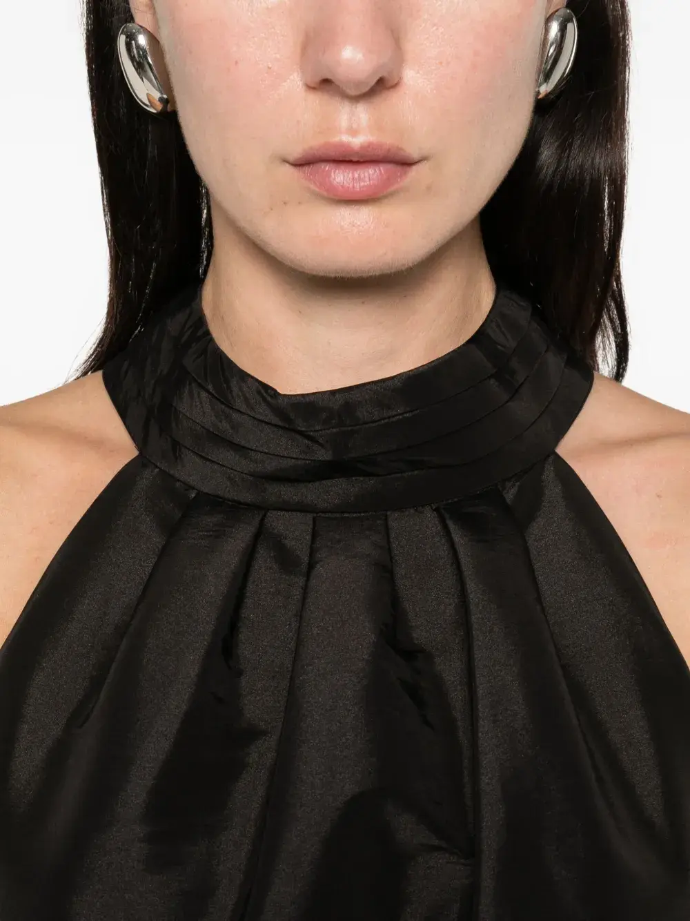 черный топ без рукавов с высоким воротом, украшенный бантом и оборками