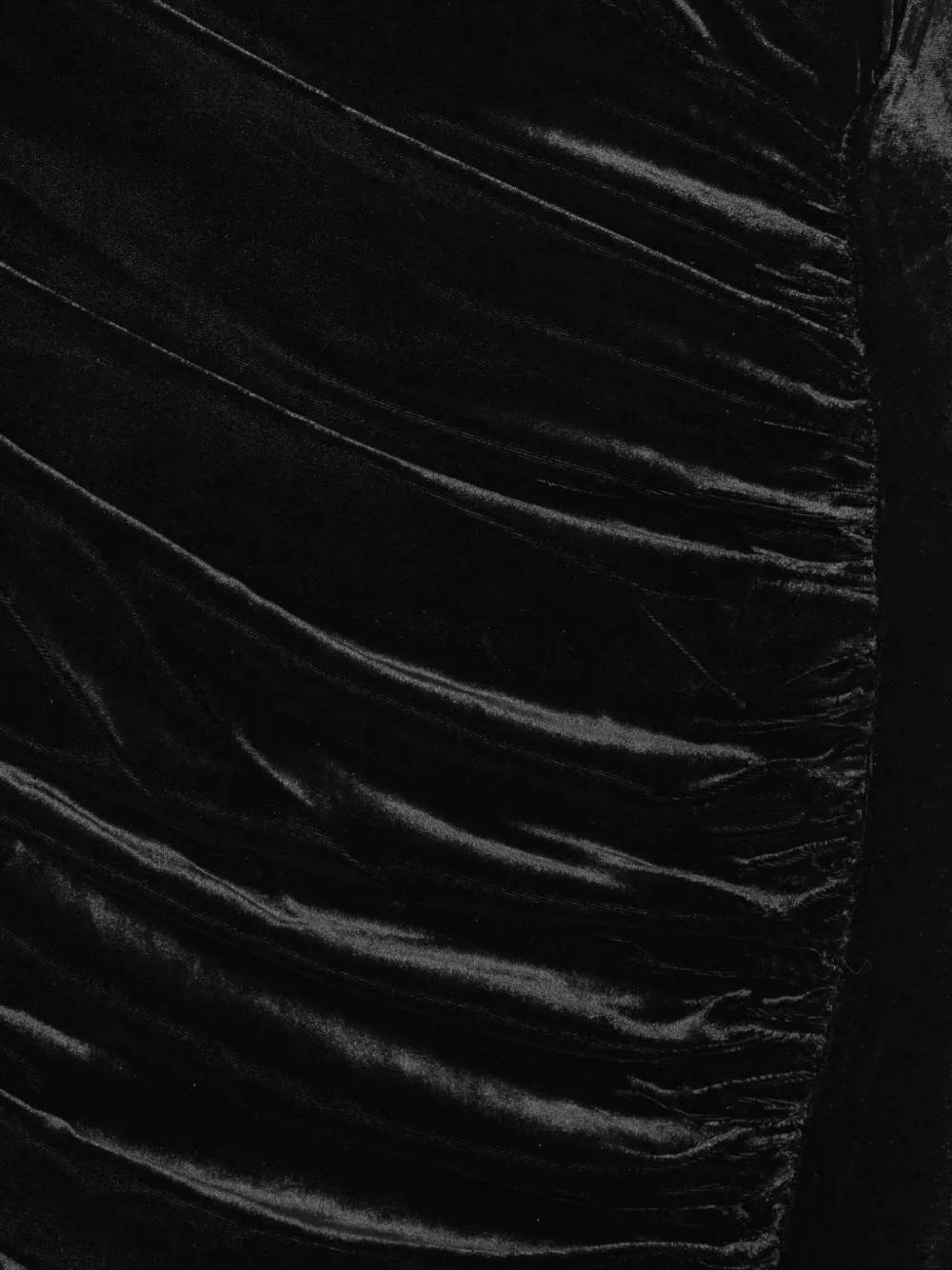 чёрная бархатная текстура, сборки, без рукавов, застёжка-молния сзади, разрез сзади