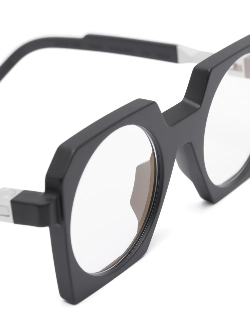 чёрная геометрическая оправа, серебристые детали, носоупоры, прямые заушники, изогнутые концы, все очки на FARFETCH продаются без корректирующих линз, в комплекте идёт защитный футляр