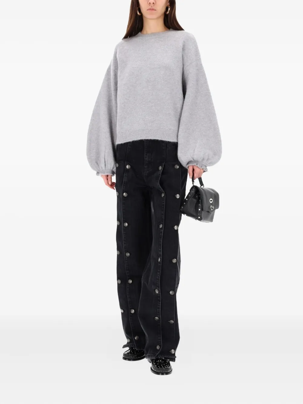 серый свитер с круглым вырезом, длинными рукавами-буфами, эластичными манжетами и ребристым подолом