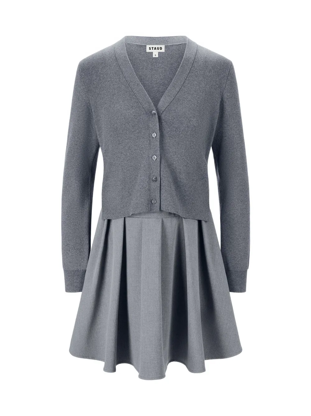 серая плиссированная юбка с V-образным вырезом, застежкой на пуговицы и длинными рукавами