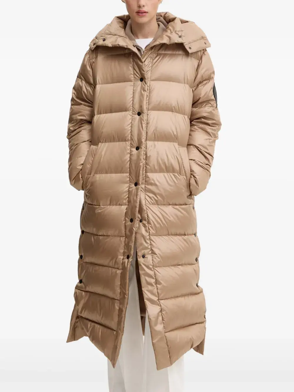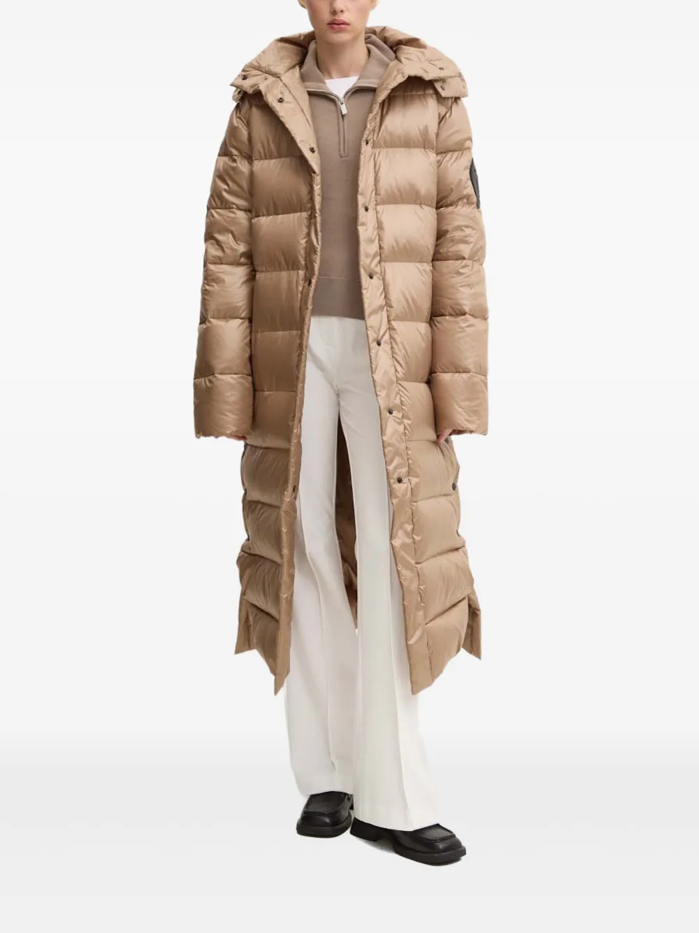 тёплый бежевый цвет, стёганый дизайн, капюшон, застёжка на кнопки, боковые карманы, нашивка с логотипом