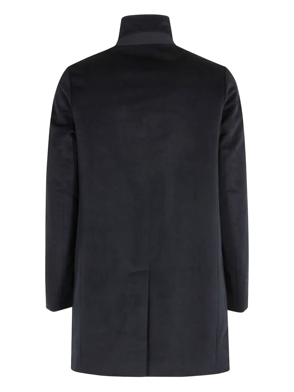 прусско-синий цвет, застёжка на пуговицы, накладные карманы спереди, высокий воротник