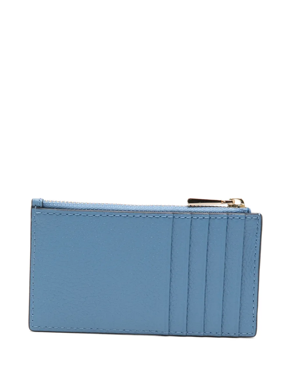 светло-голубая кожа, застёжка-молния, карманы для карт, фурнитура золотистого цвета, зернистая текстура