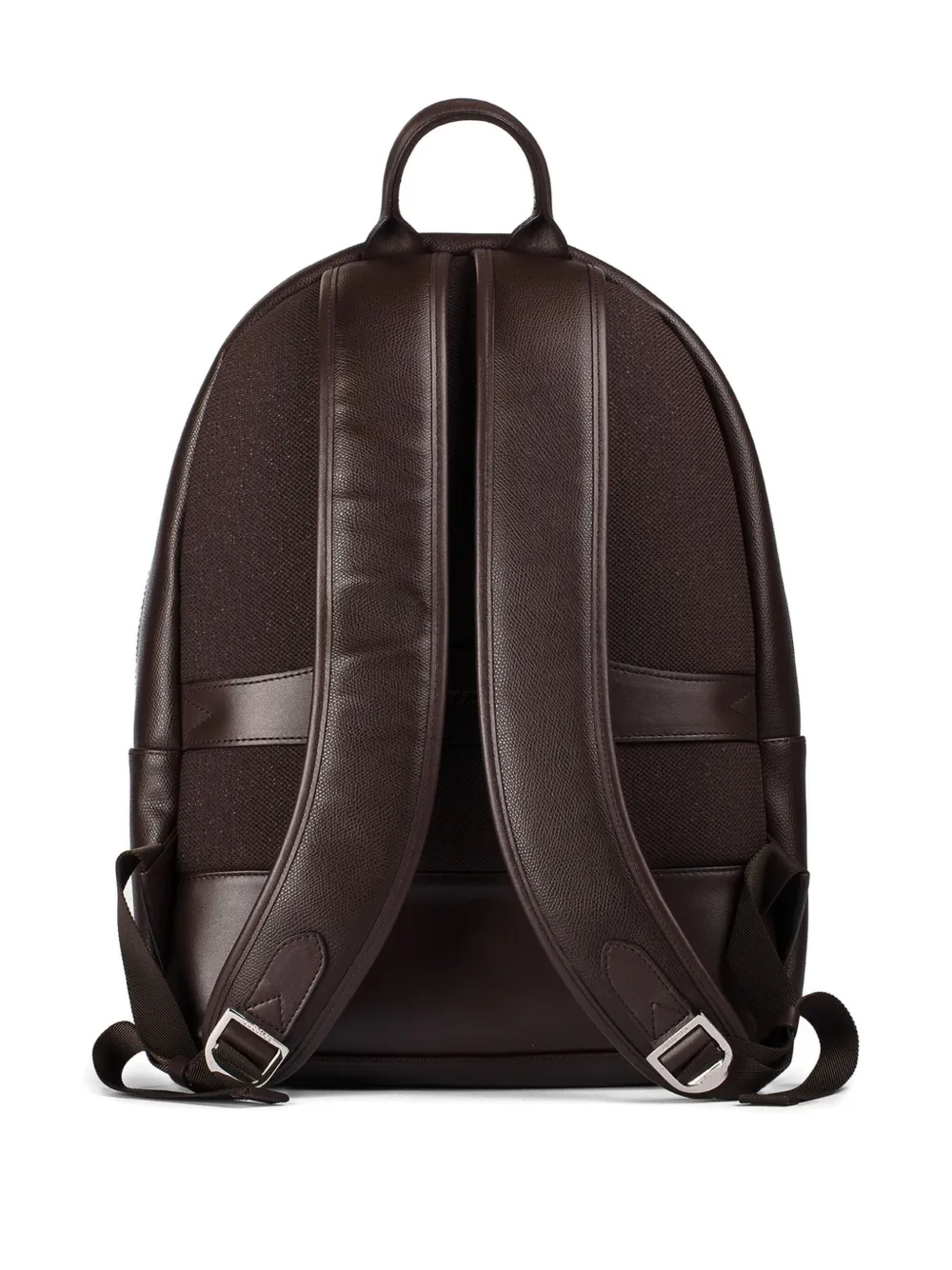 тёмно-коричневая телячья кожа, передний карман на молнии, верхняя ручка, регулируемые плечевые ремни, застёжка-молния