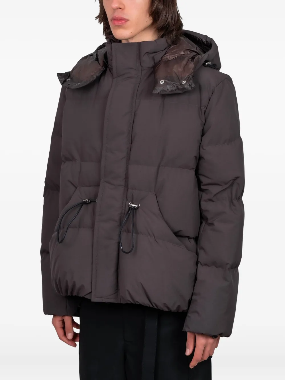 серый пуховик с капюшоном, передними карманами, шнурком и застежкой на кнопки