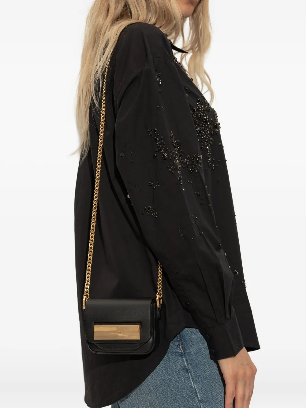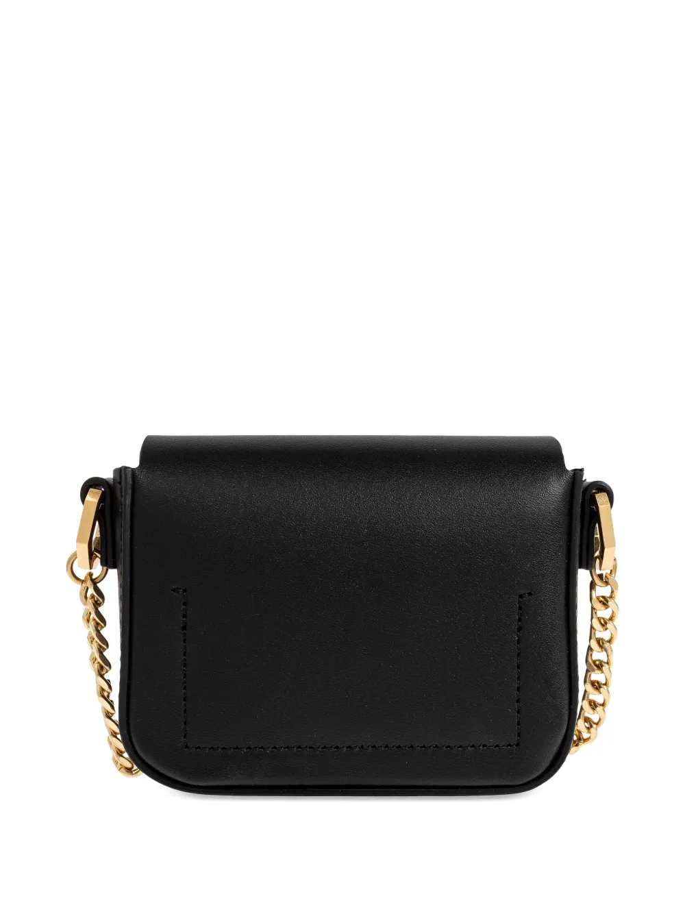 черная прямоугольная сумка с клапаном, украшением и цепочным ремешком