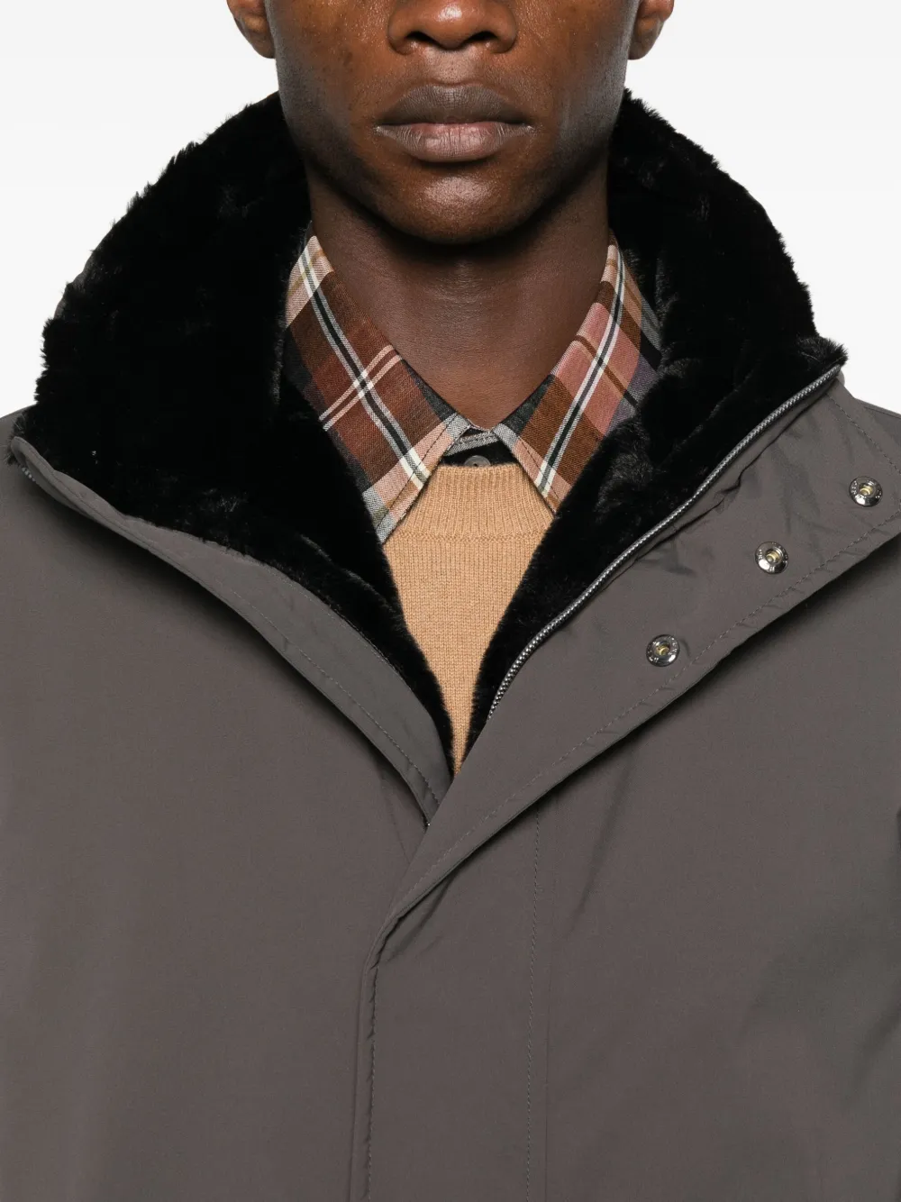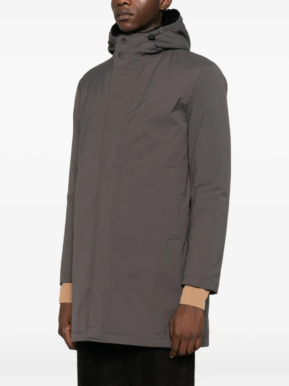 темно-серый худи с застежкой на пуговицы, передними карманами, длинными рукавами и прямым подолом