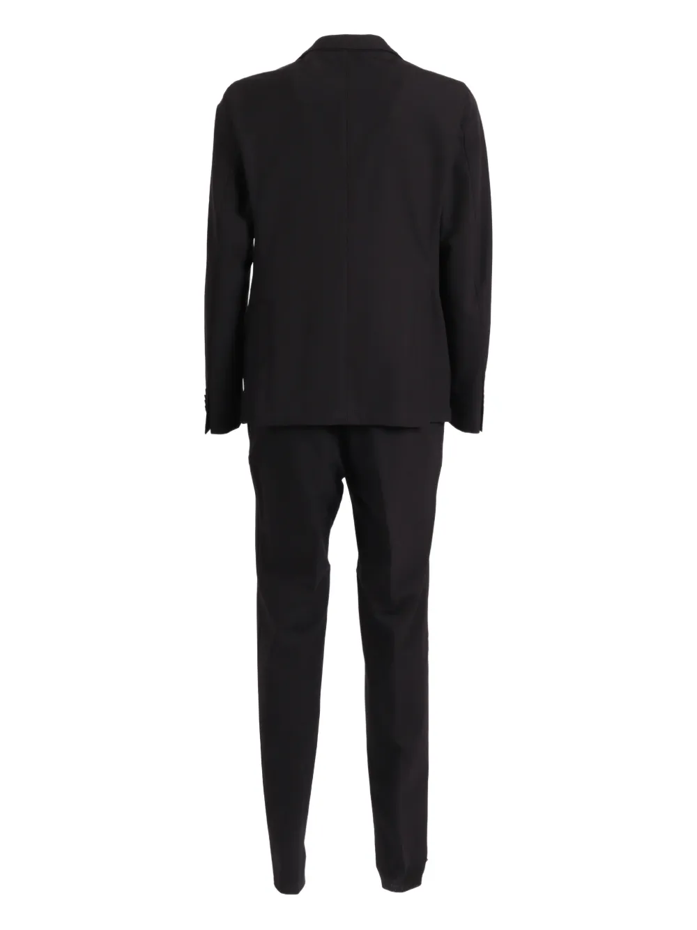 чёрный двухпредметный комплект, застёжка на две пуговицы, передние карманы, лацканы с вырезом, манжеты на пуговицах