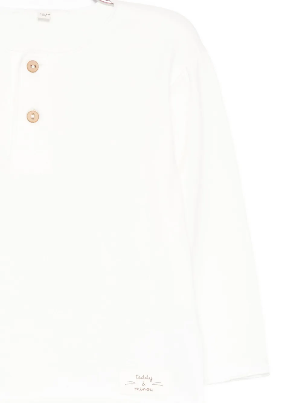 белый топ с длинными рукавами, круглым вырезом, застежкой на пуговицы и с логотипом