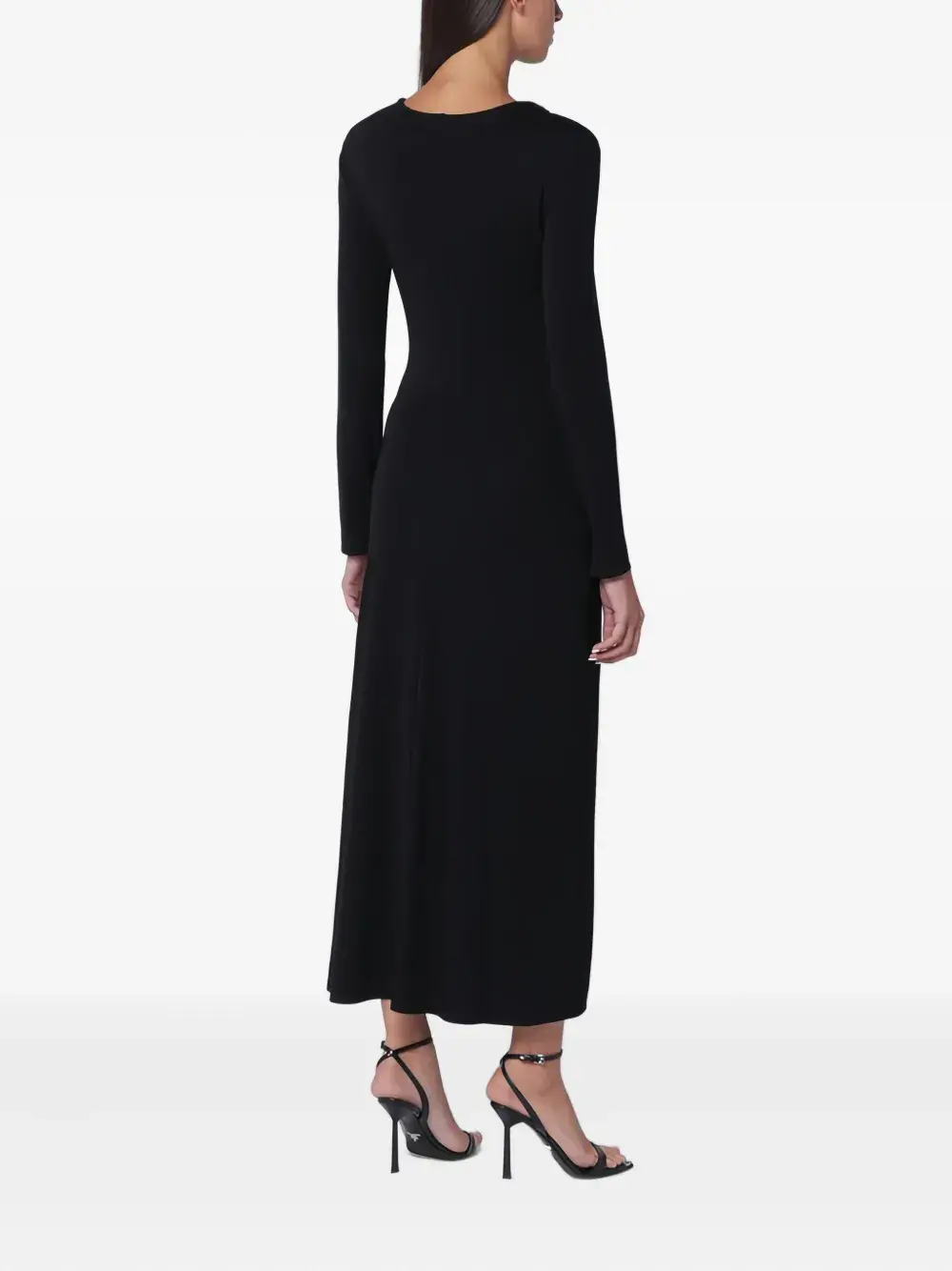 черное платье с длинными рукавами, круглым вырезом, драпировкой, средней длины, с прямым подолом
