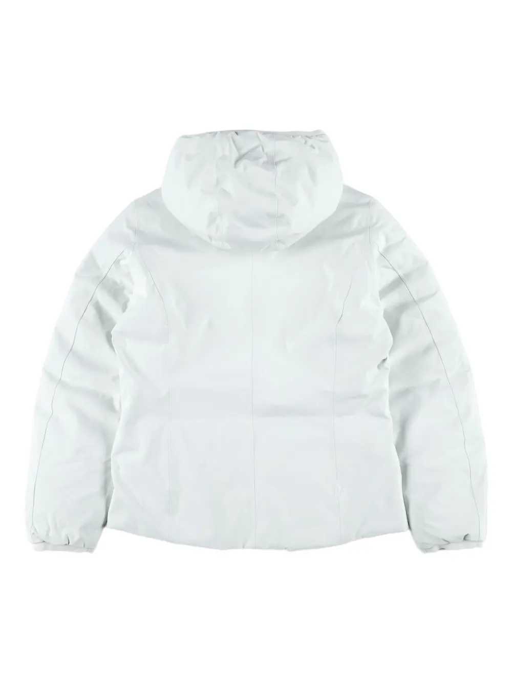 белая стёганая куртка с двусторонней молнией, капюшоном, боковыми карманами и логотипом