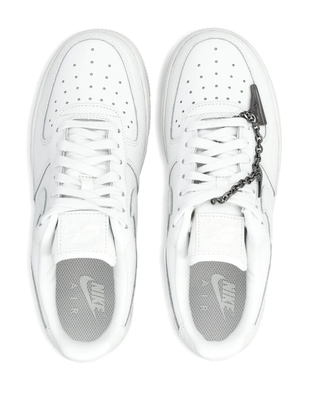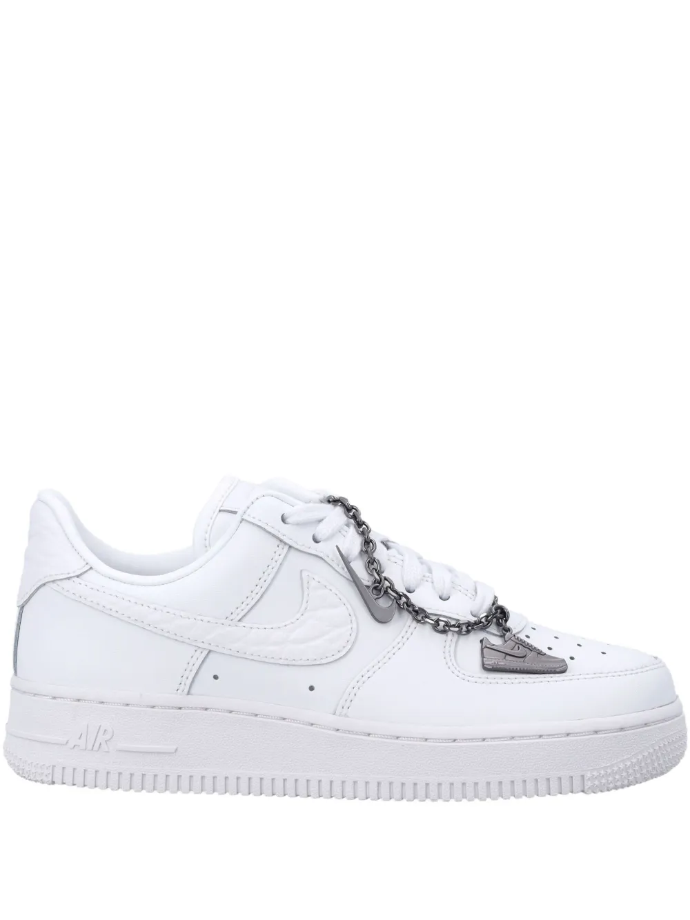 белые кроссовки с цепочкой, нашивкой с логотипом, шнуровкой, круглым носом и резиновой подошвой