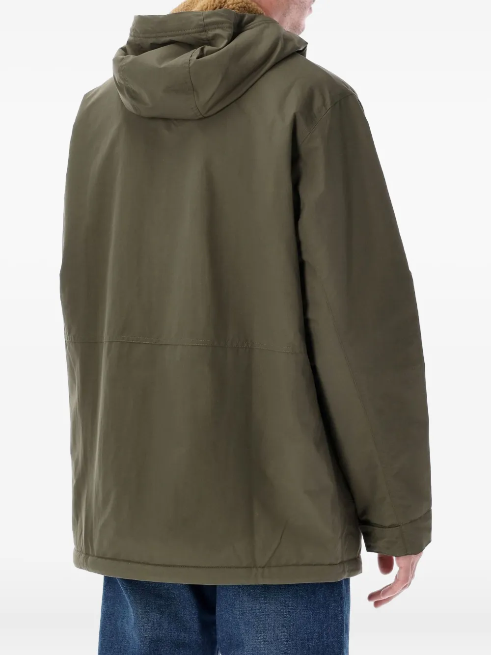 зелёный цвет, капюшон, нашивка с логотипом, накладные карманы спереди, застёжка на пуговицы, длинные рукава