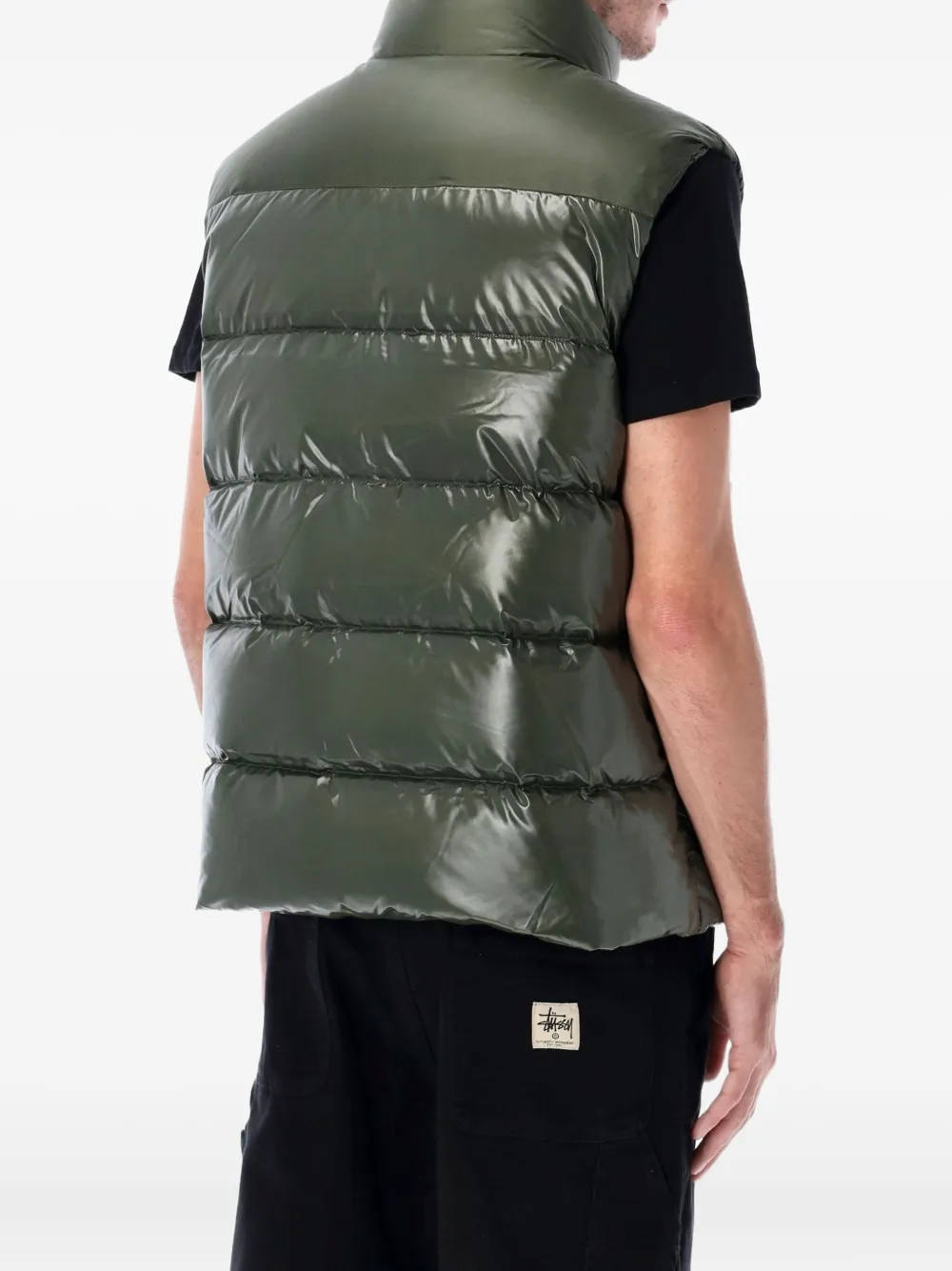 темно-хаки, стеганый дизайн, нашивка с логотипом, застежка-молния, высокий воротник, без рукавов