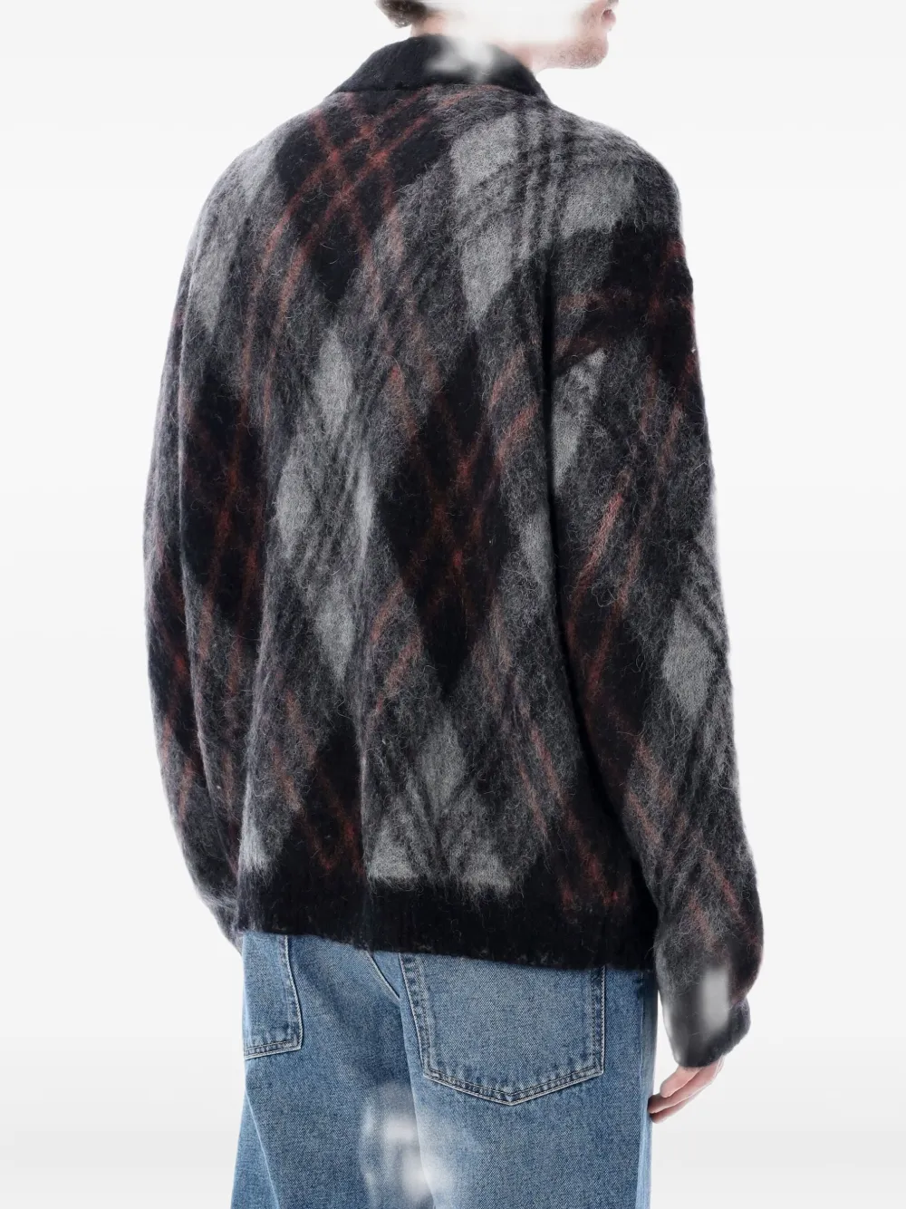 черный джемпер с ромбовидным узором, отложным воротником на пуговицах и длинными рукавами