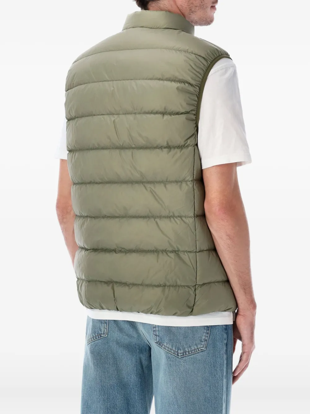 оливково-зеленый жилет без рукавов с высоким воротником, застежкой-молнией и нашивкой с логотипом