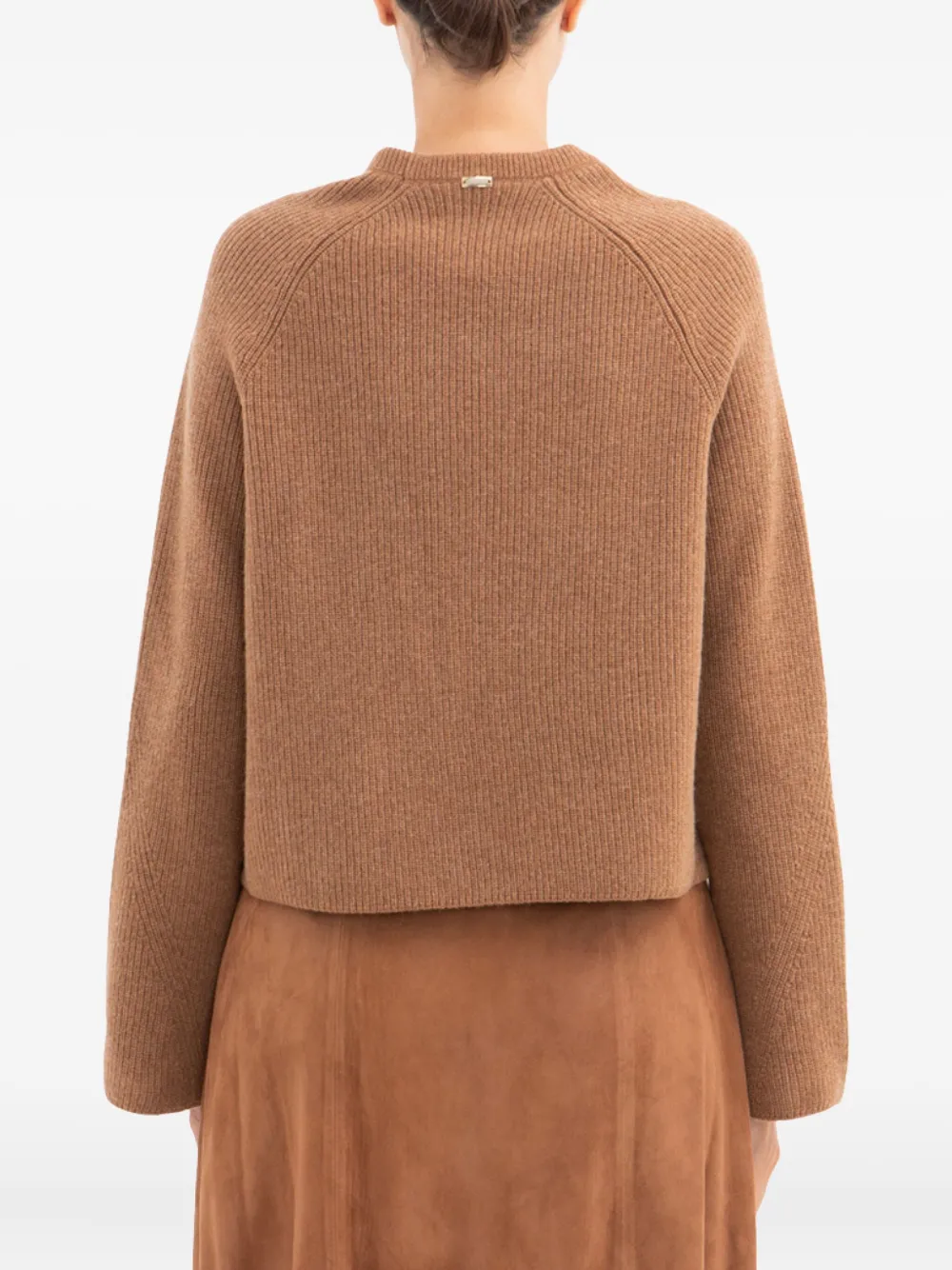 коричневый свитер из рубчатой вязки с вставками из замши, круглым вырезом, длинными рукавами и двумя передними карманами