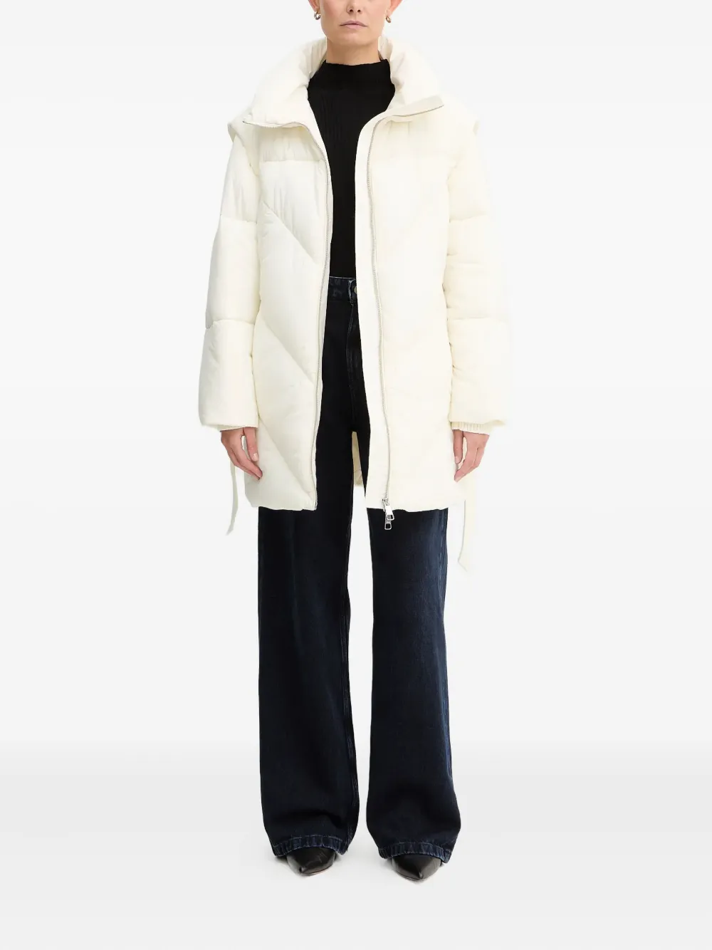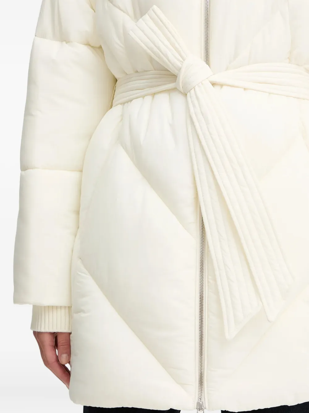 стеганый дизайн, высокий воротник, застежка-молния, пояс на завязке, длинные рукава